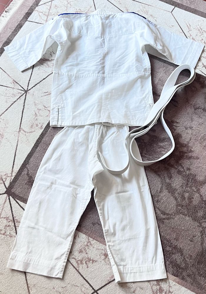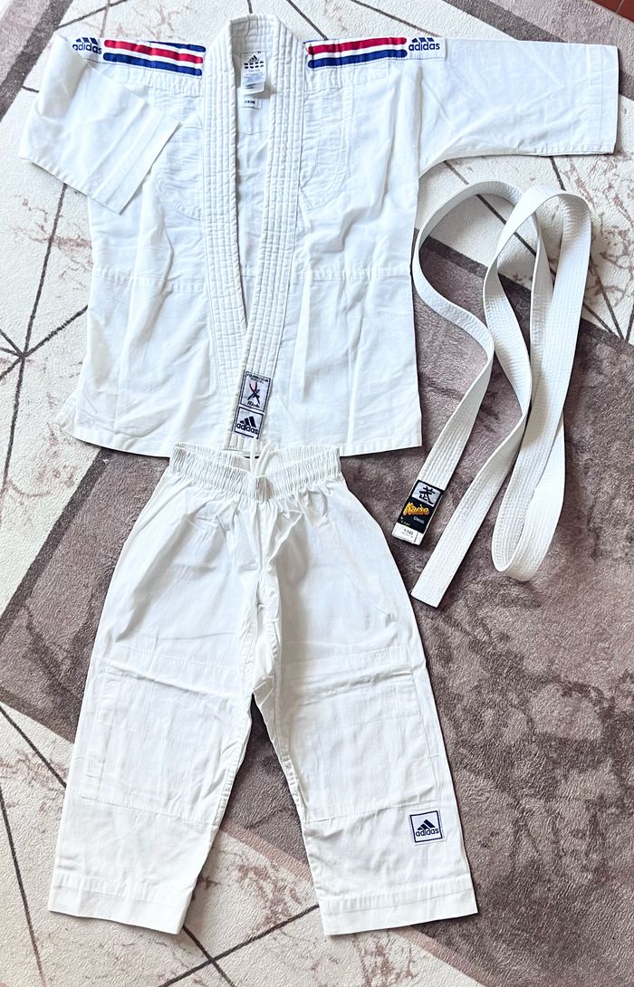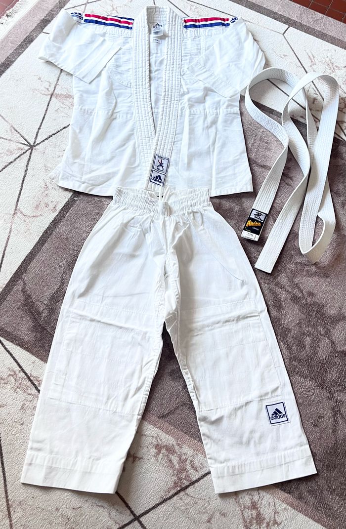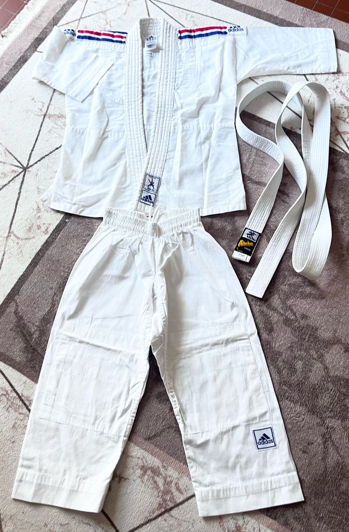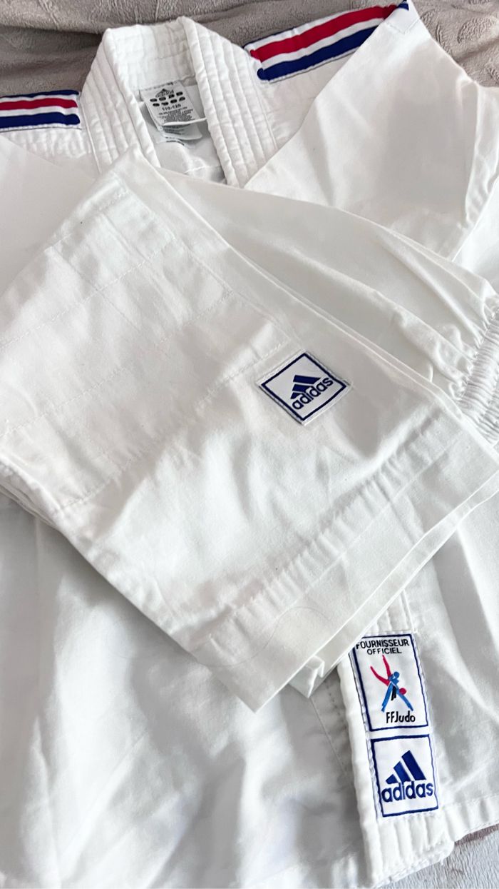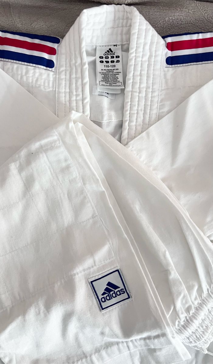 Kimono judo Adidas FF judo 110-120 cm 100 % coton Coloris blanc et bleu et rouge l Peu porté et de belle qualité Avec ceinture blanche kaiso 1/140 100 % coton Kimono unisexe Petit point sur la manche Maison non fumeur et sans animaux 📦Je réponds rapidement aux messages 📩Envoi rapide et soigné