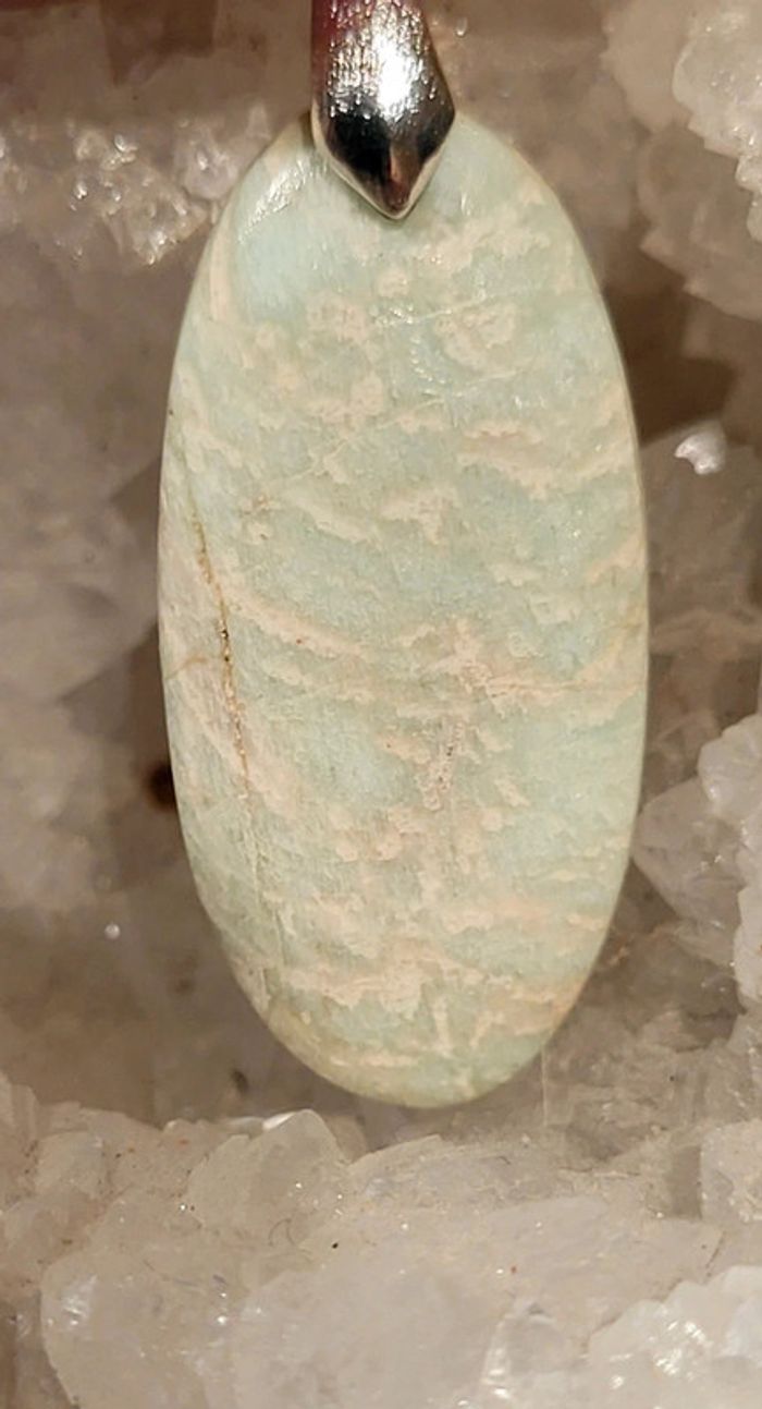 Amazonite montée en pendentif vendue sans chaine ni cordon. Neuve. 33 x 16 Origine : Namibie Sur le plan psychologique, la pierre amazonite ressemble tout particulièrement à la turquoise, offrant les principales vertus de la tendresse. Elle offre la perception des sentiments sincères et réciproques, et donne à celui qui la porte la sensation de bonheur. L’amazonite procure l’apaisement, notamment lorsqu’il s’agit du sentiment de frustration. Dans le domaine physique, la pierre amazonite permet de lutter contre les états de tristesse, mais aussi permet de réguler les carences sexuelles consécutives ou étant directement liées à une forte émotivité. L’amazonite renforce le système immunitaire et permet de soulager les problèmes liés au cholestérol, au triglycéride, au foie et aux reins. Cette pierre est notamment conseillée pour les problèmes liés au système lymphatique et respiratoire. Elle permet de soulager les douleurs articulaires et les crampes. L’amazonite est idéale pour absorber les micro-ondes, ondes électromagnétiques et ondes électrostatiques. Elle favorise l’absorption du calcium et se révèle d’une très grande aide pour lutter contre la fragilisation des os et les caries. Cette pierre lutte contre la perte de cheveux et offre leur réparation