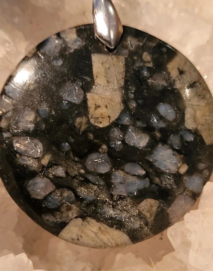 Que Sera montée en pendentif. Forme ronde. Neuve. Diamètre : 34 mm. Vendue sans chaine ni cordon. Que Sera est le nom donné à une formation rocheuse combinant des inclusions de quartz bleu, de feldspath , de la calcite, de la kaolinite, du fer, de la magnétite, du leucosome et de la clinozoisite, traces de minéraux. La combinaison de ces différents minéraux crée des propriétés énergétiques uniques. Cette pierre aide à prendre des décisions plus éclairées. Sa fréquence vibratoire se connecte à tous nos chakras pour les nettoyer et les activer. Elle ajuste notre champ énergétique pour le rendre plus harmonieux. Ce qui permet d’augmenter notre bien-être. Ses belles vibrations nous aident à nous connecter aux dimensions supérieures ce qui élève notre conscience