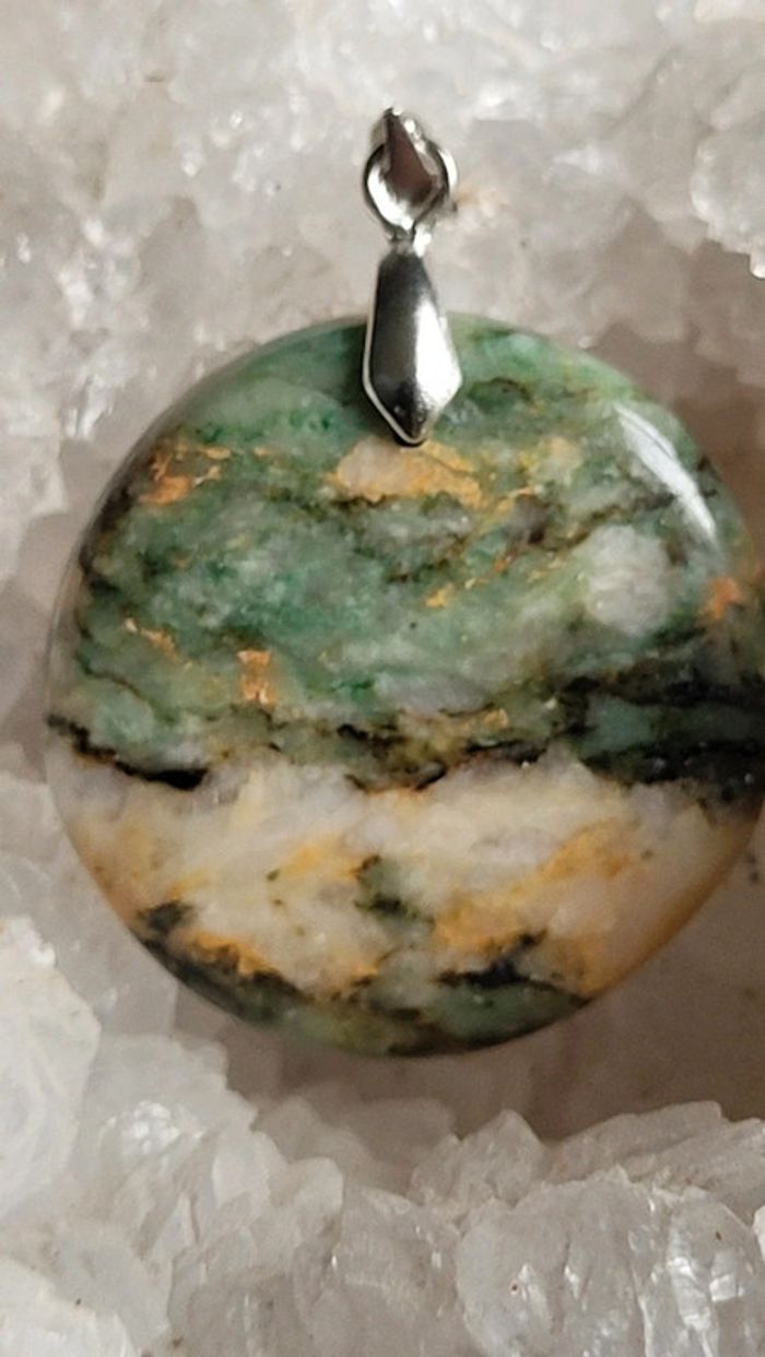 Mariposite montée en pendentif vendue sans chaine ni cordon, neuve .Diamètre 27 mm. La Mariposite est idéale pour retrouver un peu de calme intérieur, elle permet d'équilibrer les chakras en douceur Elle protège les personnes hypersensibles. Elle peut aider à soulager les insomnies.