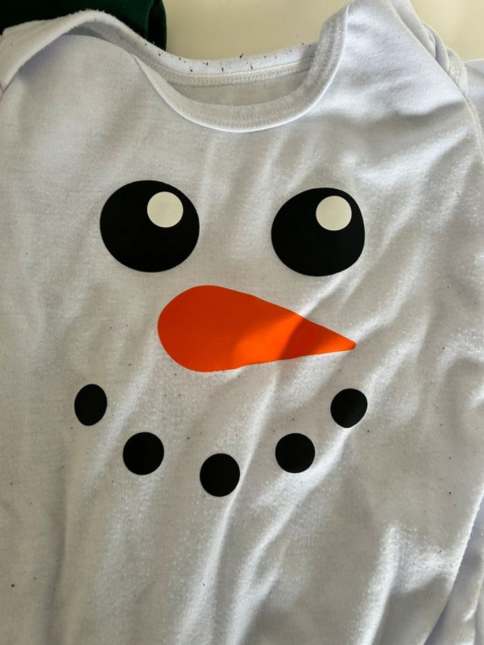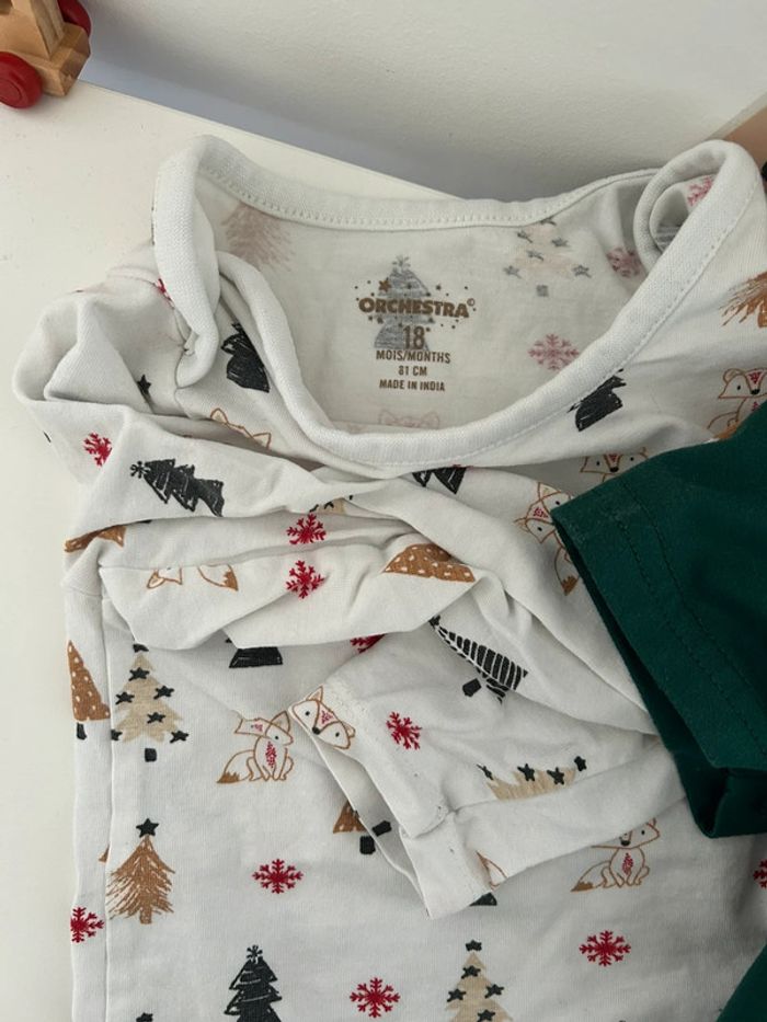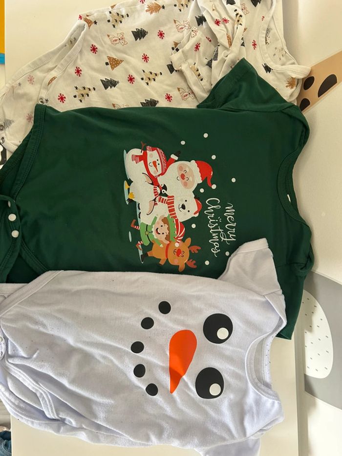Un bodie orchestra motifs Noël et 2 bodies SHEIN en moins bon état (un floque bonhomme de neige et l’autre motif père noel ) voir photos 18 mois