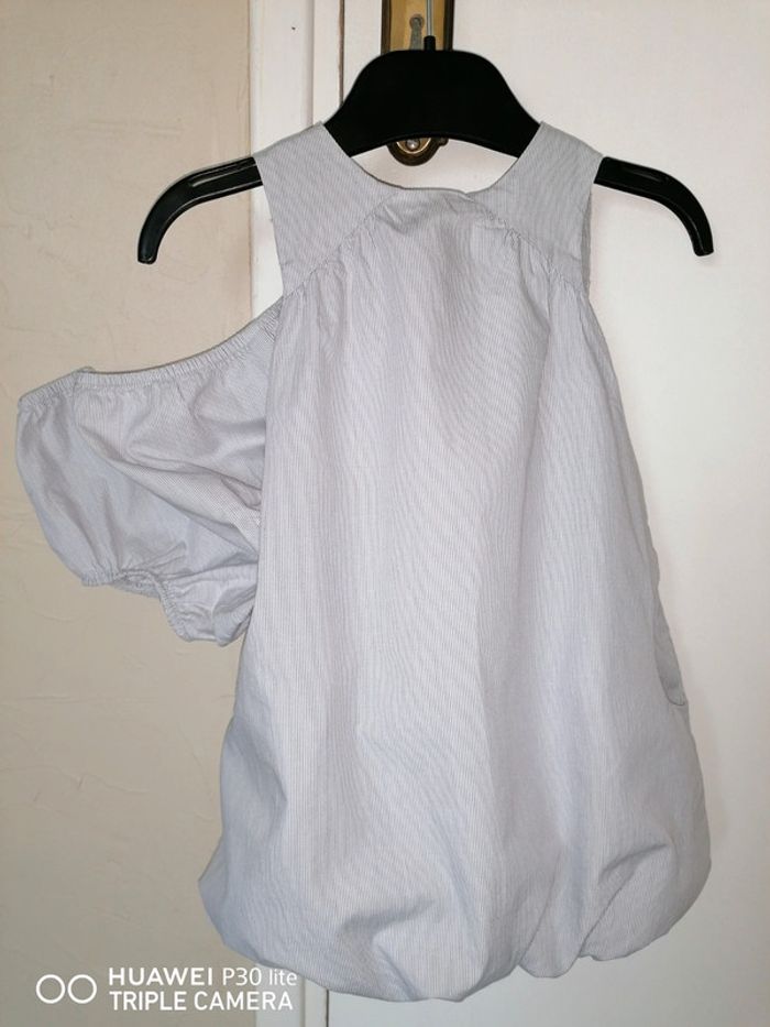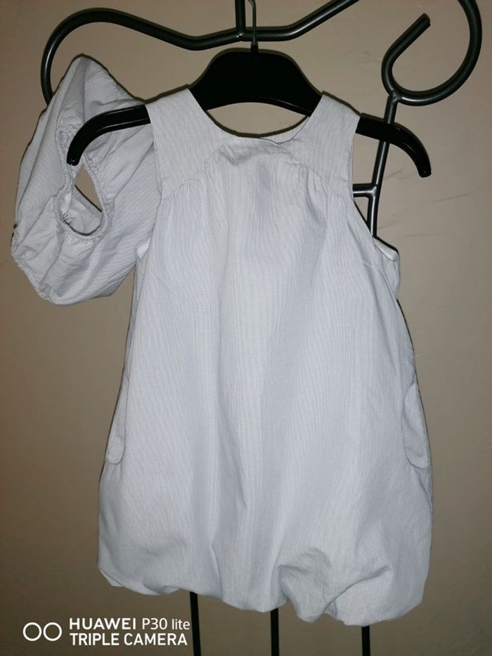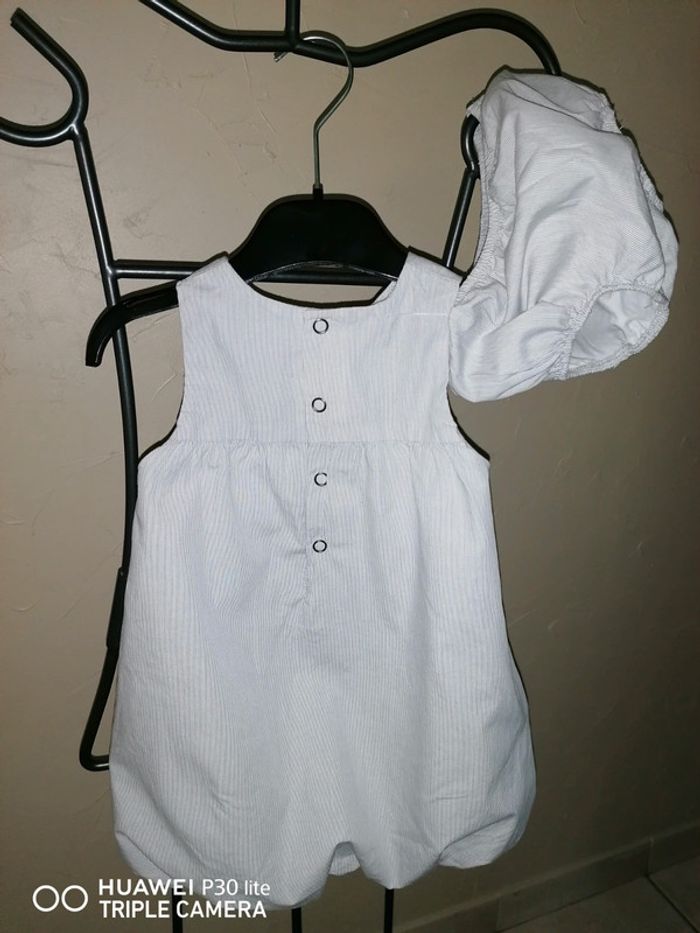 Vends robe bouffante Obaïbi, grise et blanche à fines rayures, avec sa culotte, 2 poches sur les côtés, pressions en haut du dos