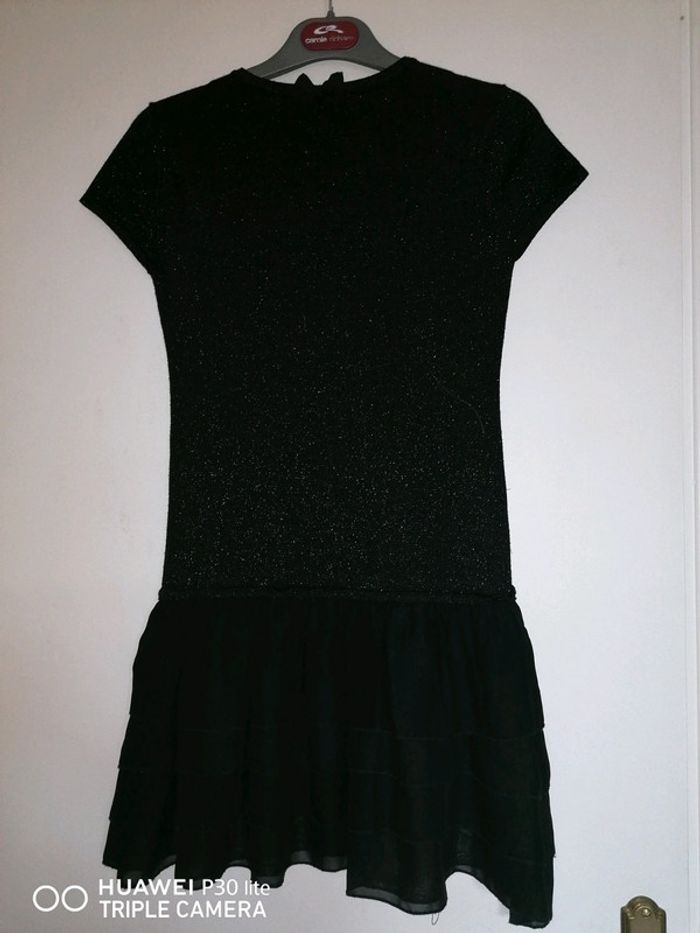 Vends robe CFK très bon état, le haut et en tissu noir pailleté et le bas en voile, se ferme avec une pression caché d'un petit nœud...