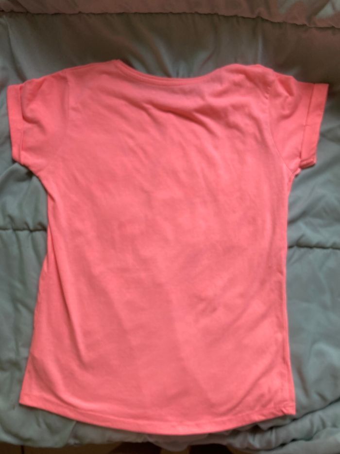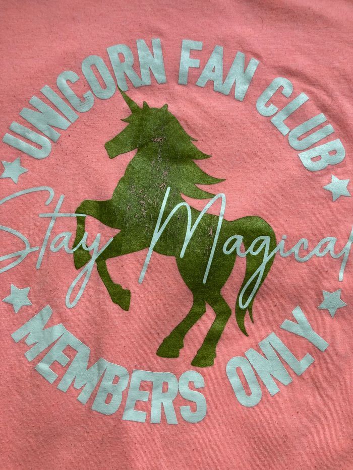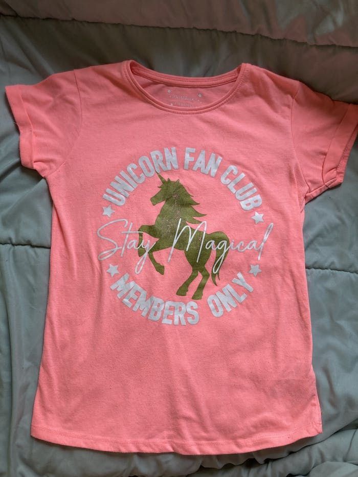 Teeshirt motif licorne dorée Coloris corail Taille 9/10 ans En très bon état mais quelques craquelures sur la licorne Prix en fonction du défaut Non négociable Envoi rapide et soigné