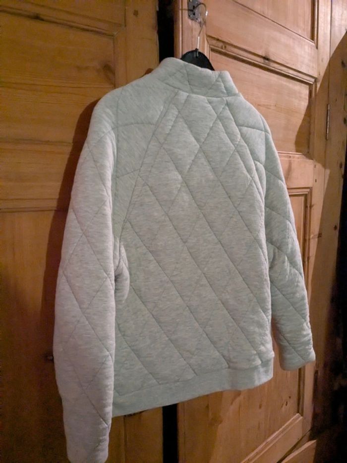 BLOUSON tubique femme gris taille 1 doublé en coton milleraies. Zippé devant, poches passepoilées en biais, bas du corps fini en bord côte, manches raglan. Look mode, chaud et cocon au porter. Prix magasin 119€