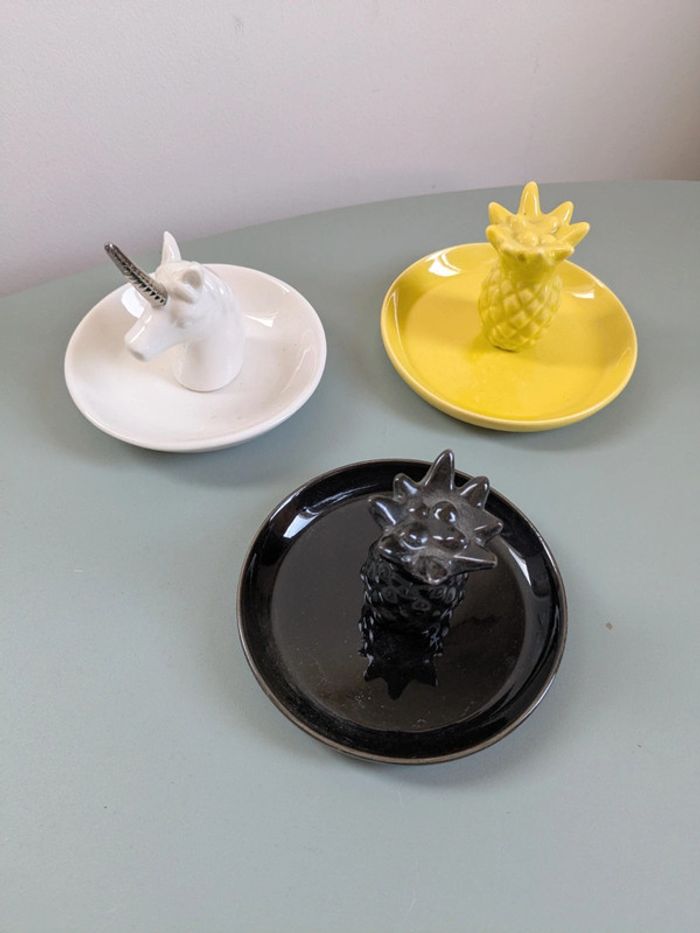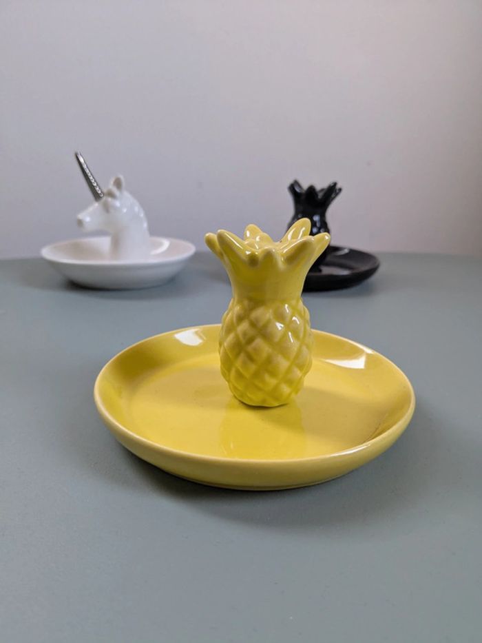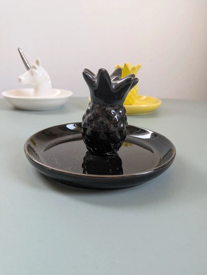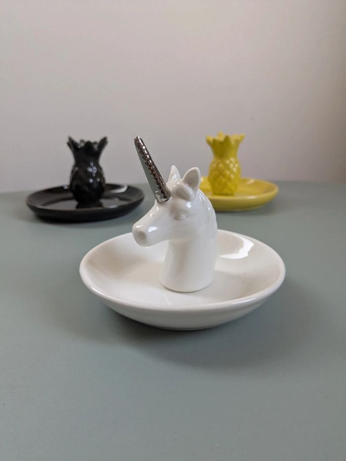 4,5€ pièce 8,5 les 2 12€ les 3 1,2 ou 3 Porte(s) bagues bijoux En forme de licorne, d'ananas blanc ou noir Dimensions : Environ 10 x 10 x 8,2 cm