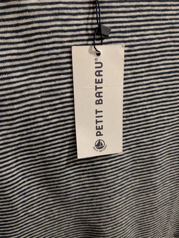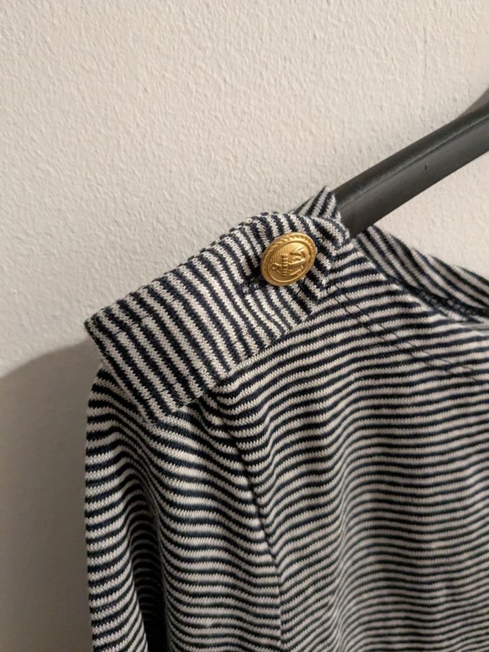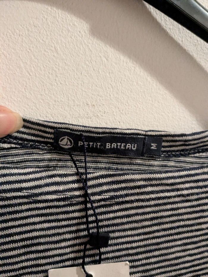 T-shirt manches longues rayé en lin Valeur magasin 65€ Couleurs = bleu smoking et blanc lait Taille M Femme Bouton épaule Petit Bateau