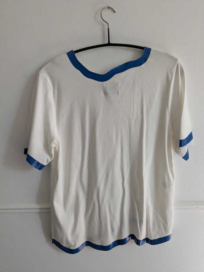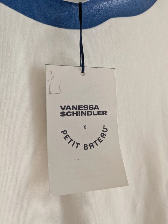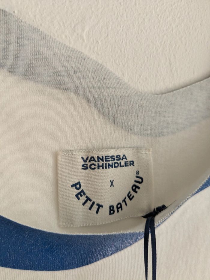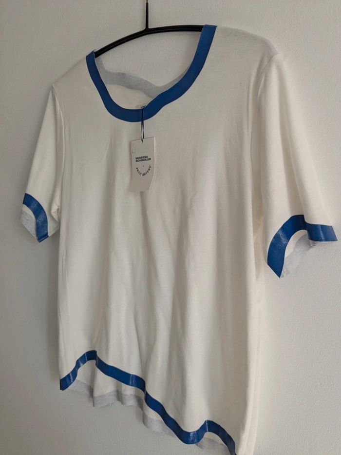 Prix magasin 49€ Vanessa Schindler tee-shirt, très mode, possède une sérigraphie en forme de vague au niveau de son col ainsi qu'en bas de manches. Il se caractérise par un ourlet coupé bords francs. Ce tee-shirt se porte ample et il est unisexe