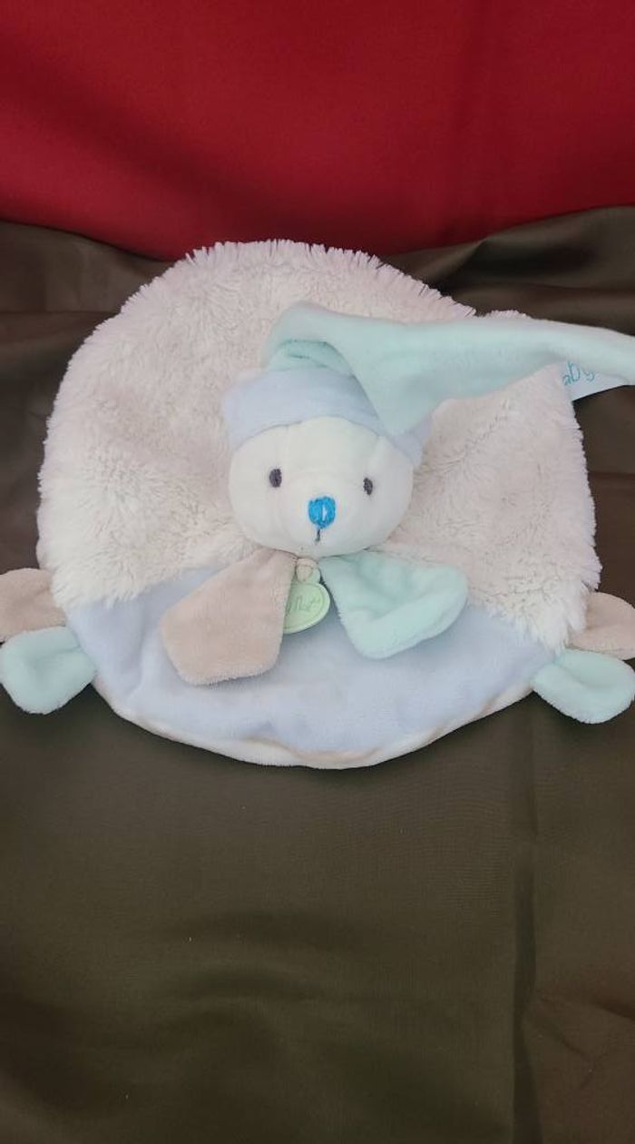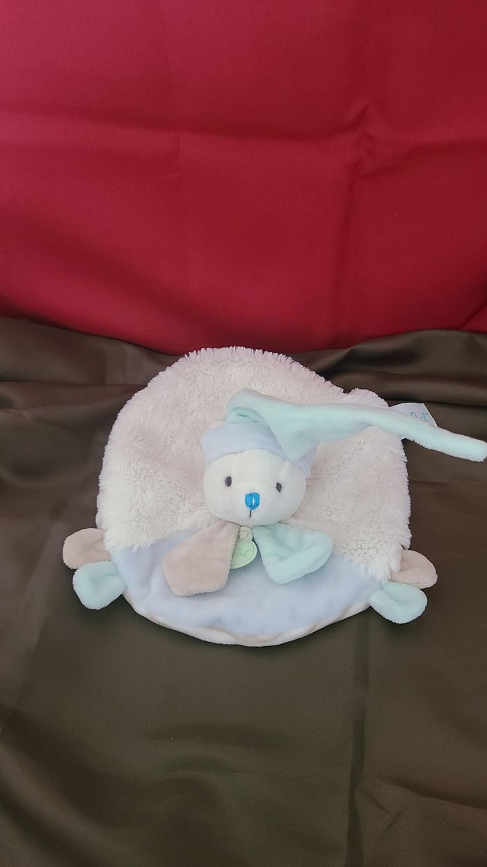Ours BABY NAT doudou rond plat bleu, blanc et vert - photo numéro 1