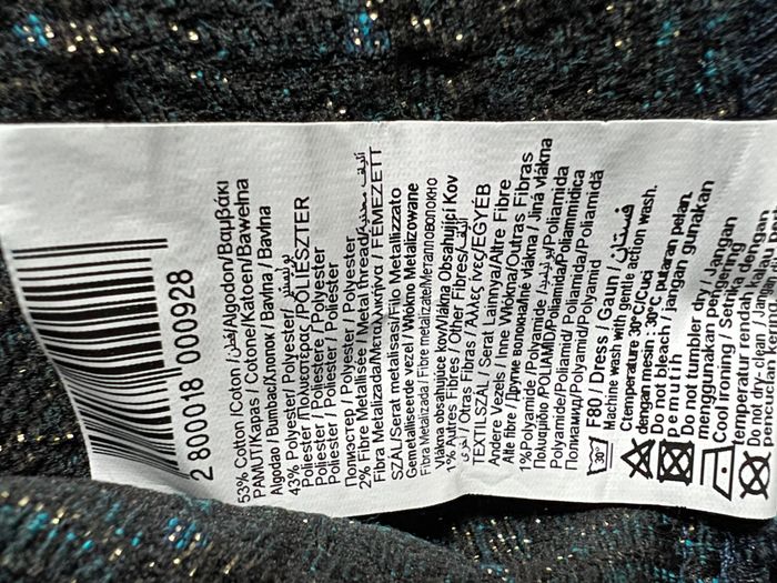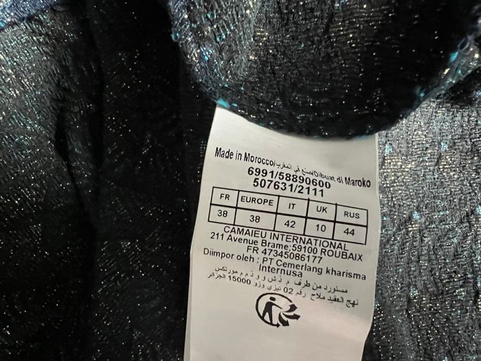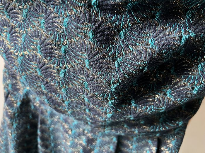 Marque "Camaïeu", neuve. Robe de cérémonie, de soirée ou de fête. Possibilité d'ajouter des bretelles (emplacements prévus). Bande antidérapante autour du bustier, haut doublé, fermeture zip dos. Tour de poitrine 86 cm, tour de taille 72 cm, longueur 73 cm (depuis le haut des seins). Très beau tissu épais motifs bleus, turquoise et fils dorés 53% coton, 43% polyester, 2% fibres métalliques dorées, 1% polyamide.