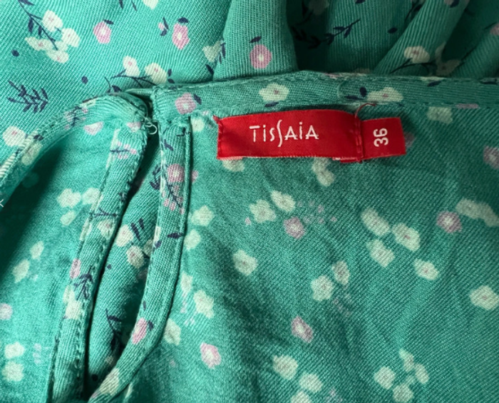 Marque "Tissaïa", neuve, jamais portée. Manches 3/4 à volantées, fermeture dos 1 bouton, ceinture. Tour de poitrine 96 cm, largeur épaules 40 cm, longueur 85 cm.