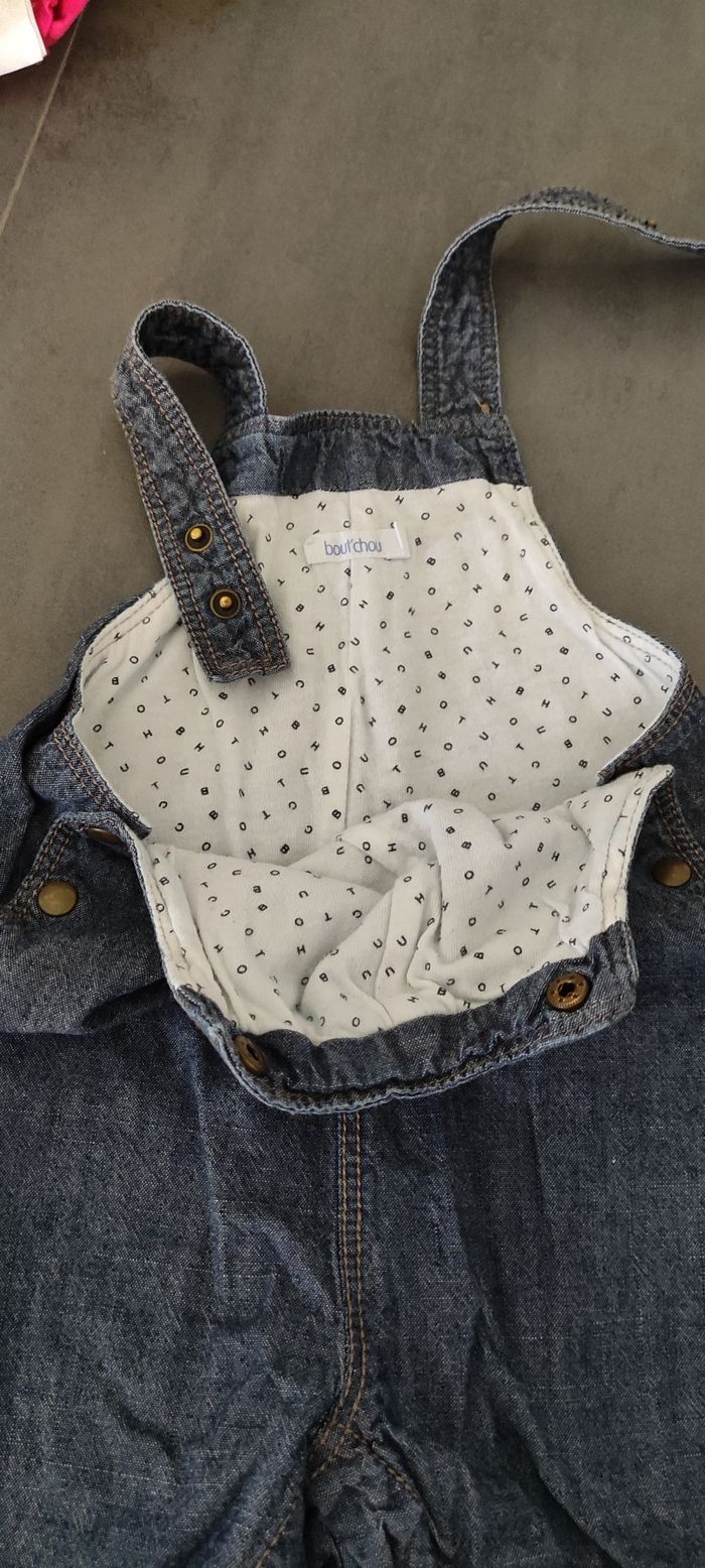 Salopette très peu portée, en jean à l'extérieur et coton à l'intérieur.