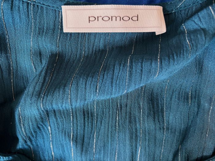 Marque "Promod", fines rayures verticales argentées, entièrement boutonnée devant. Tour de poitrine 100 cm, largeurs épaules 44 cm, longueur 65 cm. Matière 100% viscose.