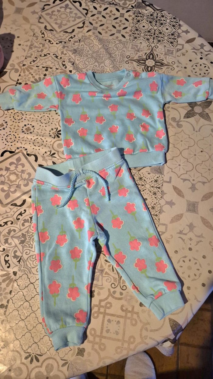 Superbe petit ensemble 3/6 mois mais taille grand donc 6 mois. La couleur est un superbe bleu en vrai la photo ne le met pas en avant