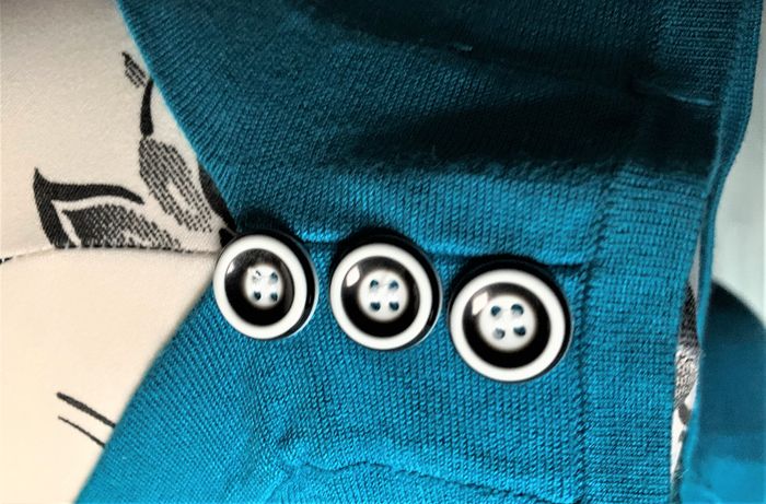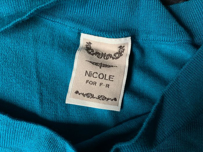 Marque "Nicole", neuve, jamais portée. 3 boutons déco sur chaque épaule, passants pour ceinture (non fournie). Tour de poitrine 85 cm, longueur 80 cm. Matière extensible 85% viscose 15% élasthanne.
