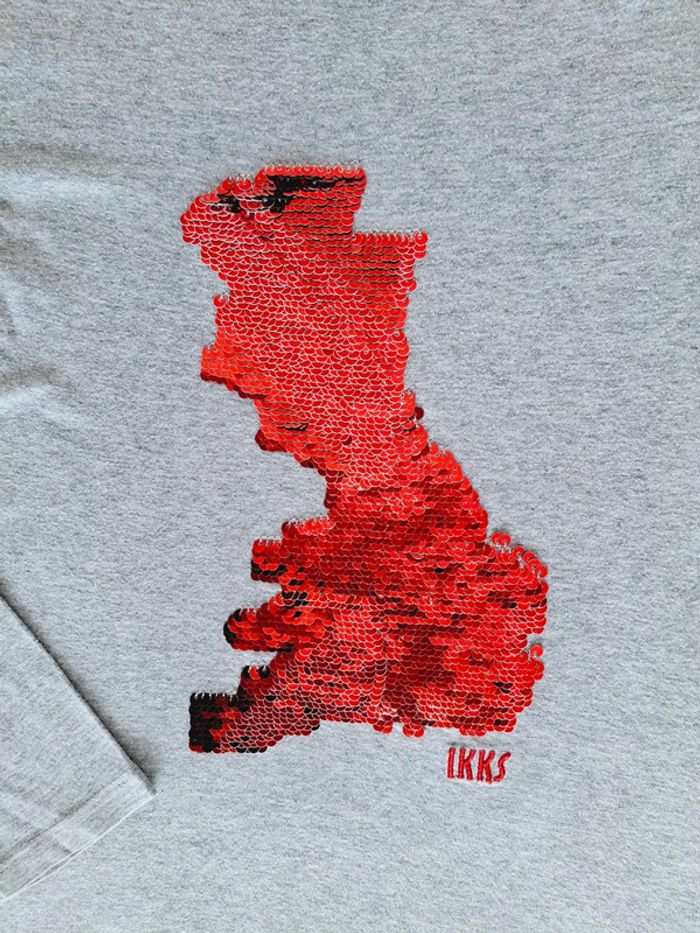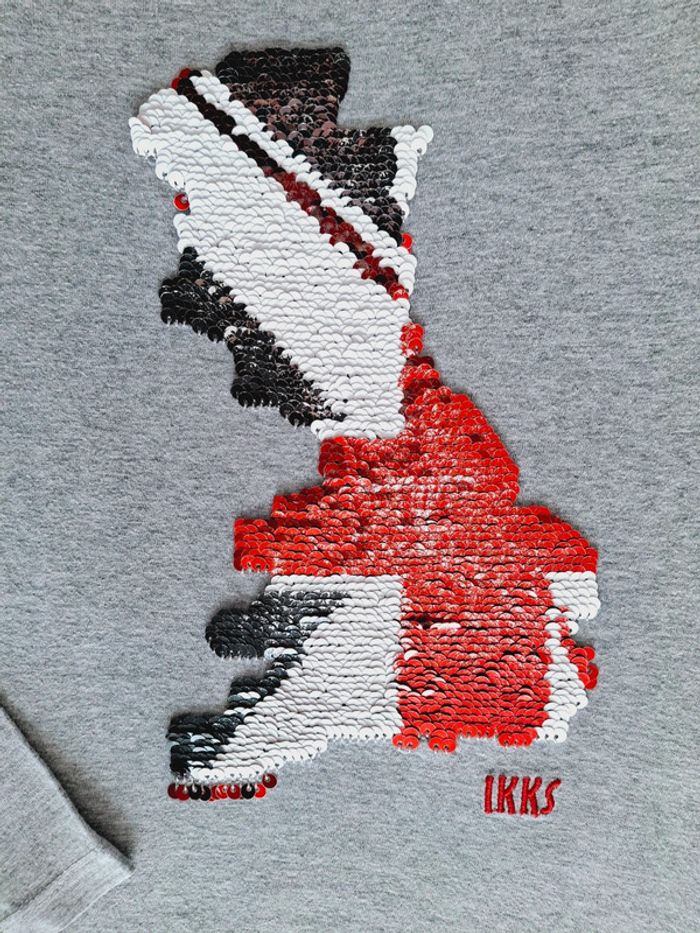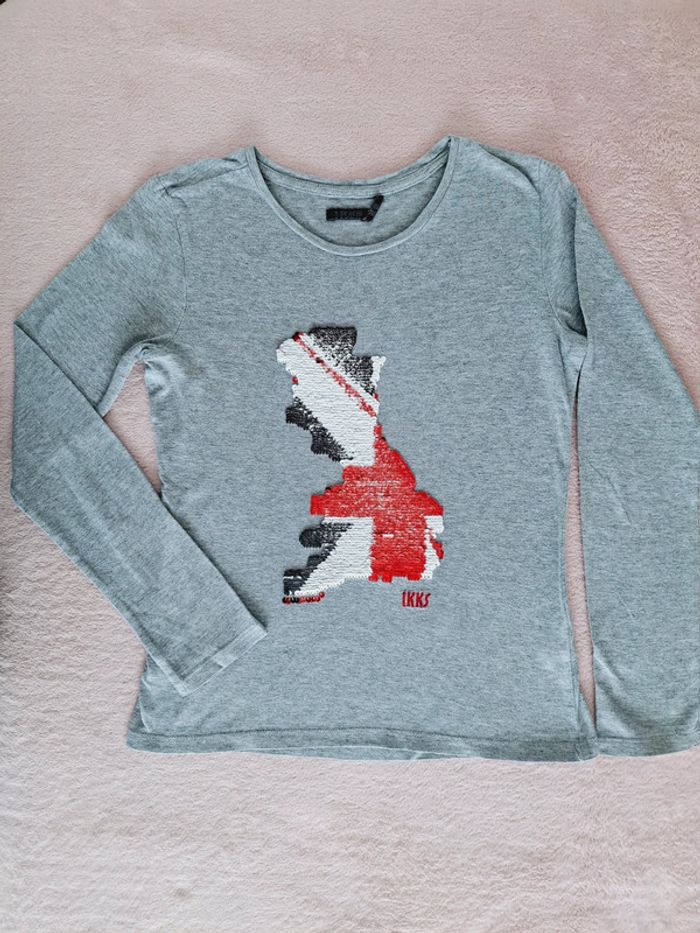 T-shirt manches longues IKKS 10 ans Gris chiné motif Angleterre en sequins réversibles : un côté blanc noir et blanc, et un côté rouge 100% coton Très bon état #adelaide7624vetementsfille10ans