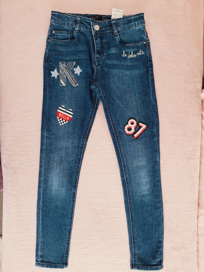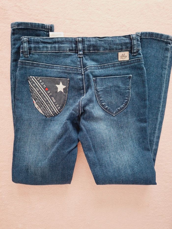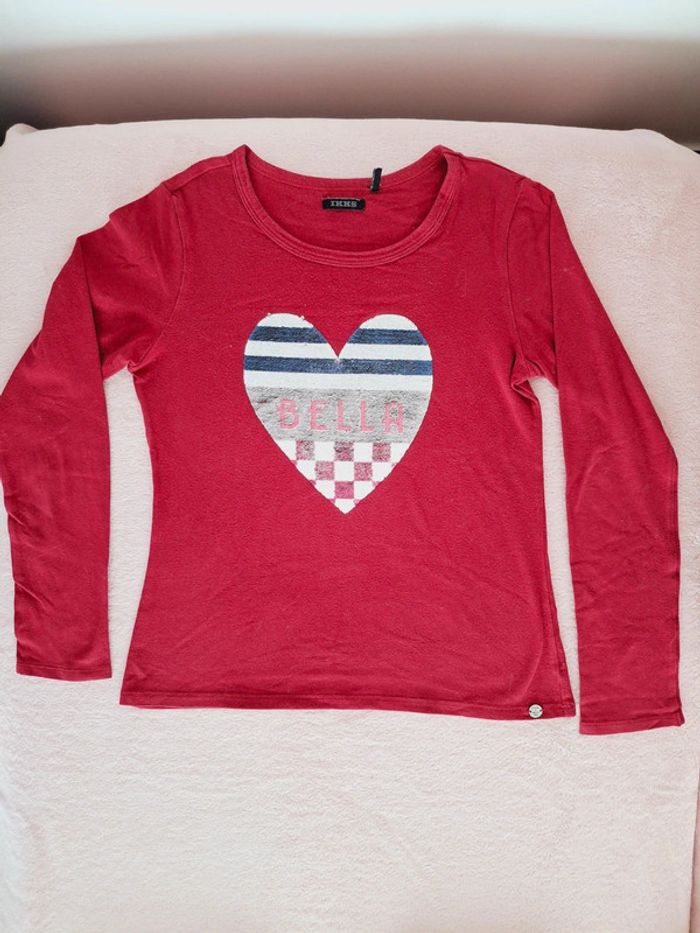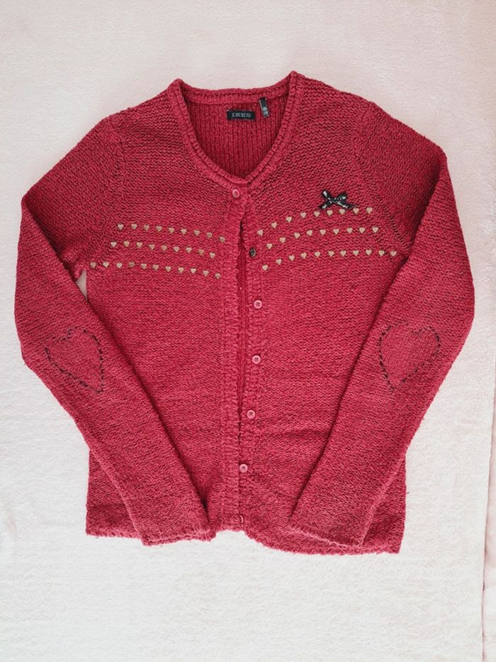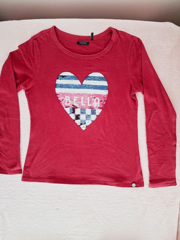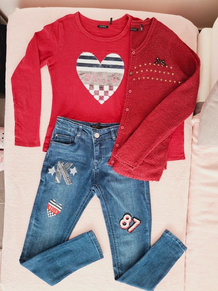 Ensemble IKKS 10 ans - Jean skinny bleu avec patch bleu marine et bordeaux Taille ajustable avec élastiques Fermeture éclair et crochet Coton élastanne stretch Très bon état - T-shirt manches longues bordeaux avec motif cœur en sequins réversibles Coton élastanne stretch Très bon état - Gilet bordeau en point de mousse Bon état, je l'offre avec #adelaide7624vetementsfille10ans