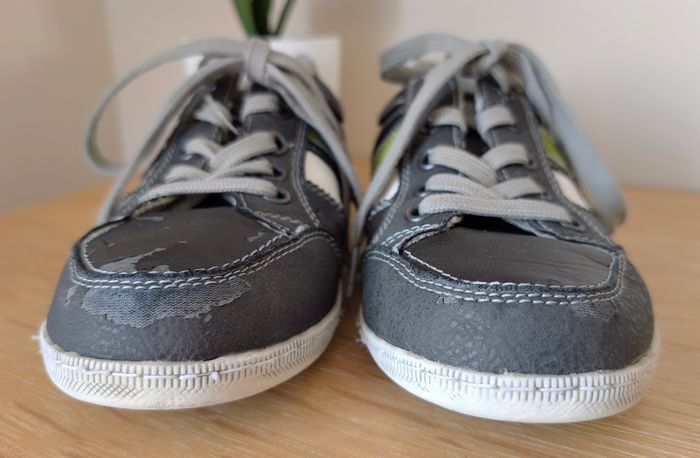 Baskets basses à lacets - Gris anthracite - Matière : Synthétique - Pointure : 34 ❌ État satisfaisant, car la matière s'enlève par endroit comme le montre les photos #kat02600chaussuregarcon34 #chaussuregarcon34 #basketgarcon34 #basketbassegarcon34 #tennisgarcon34