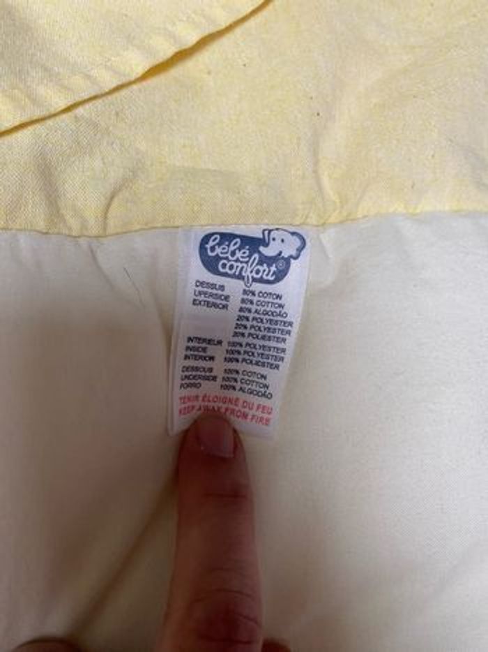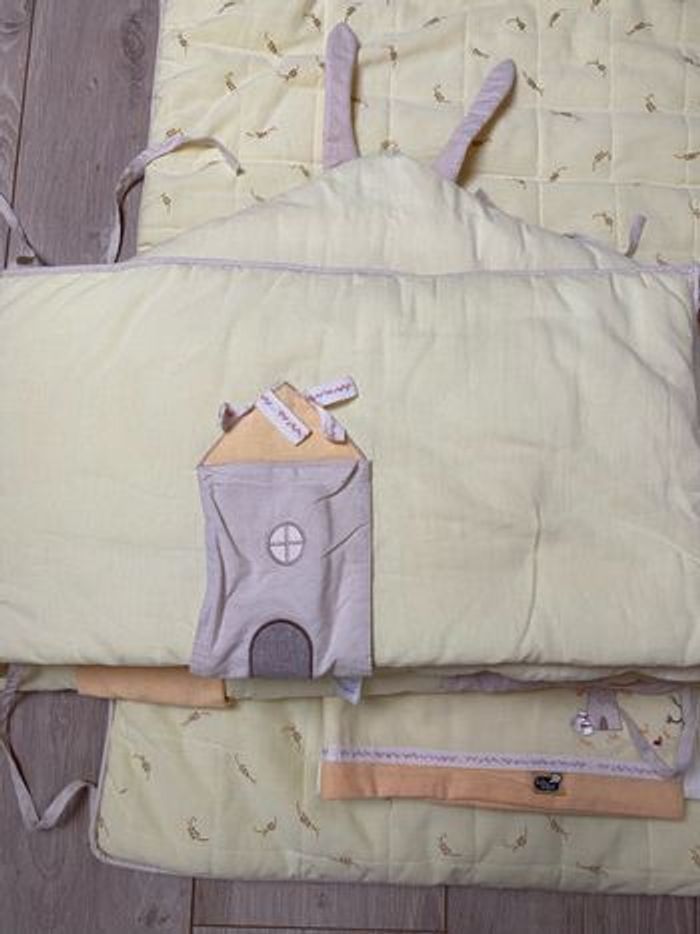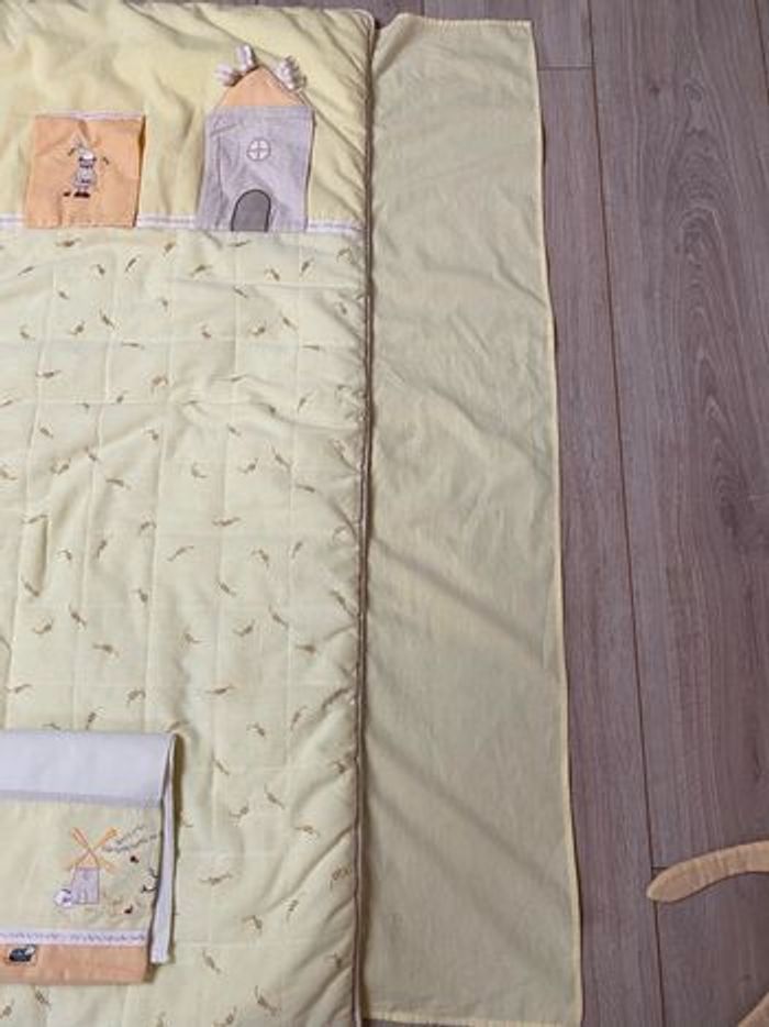 Ensemble tour de lit, dessus de lit /couverture avec rebords à coincer sous le matelas, drap plat Marque bébé confort Couleur jaune pâle Motif : épi de maïs, moulin Dimensions: -couverture : 66x116cm -drap plat: 113x163cm -tour de lit: 181cm (57 cm chaque partie)+5cm x2 sur les coins