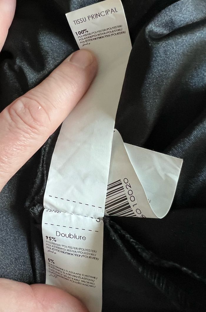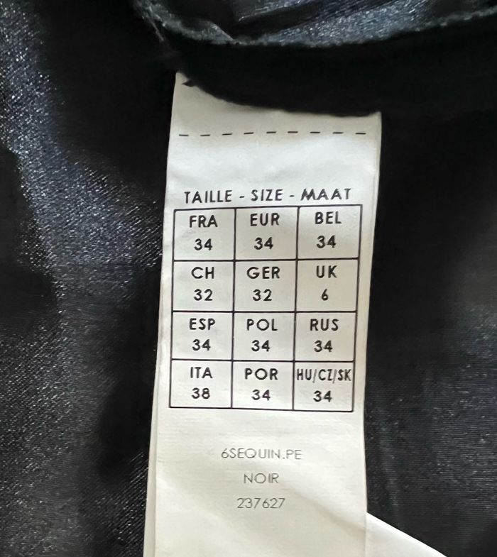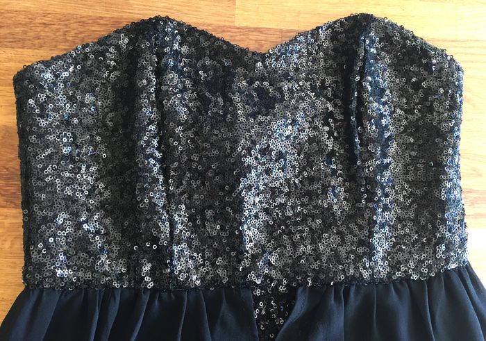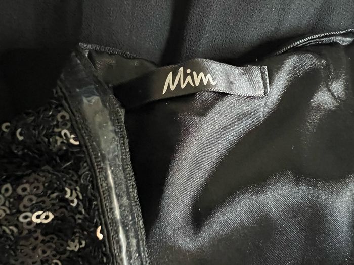 Marque "Mim", parfaite pour cérémonie, soirée ou fête. Comme neuve. Robe bustier couverte de sequins noirs, avec jupe en voile noir. Fermeture zip côté, Robe : tour de poitrine 80 cm, tour de taille 66 cm, longueur 68 cm. Jupe : longueur max dos 110 cm. Matière 100% polyester, doublure 95% polyester, 5% élasthanne.