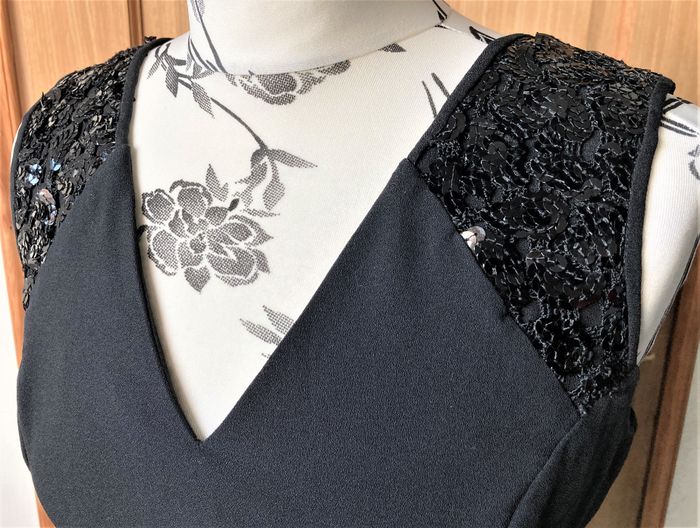 Marque "Naf Naf", robe de cérémonie, de soirée ou de fêtes. dos échancré, épaules recouvertes de sequins, fermeture zip dos. Tour de poitrine 96 cm, tour de taille 80 cm, longueur 90 cm. Matière 72% polyester, 20% viscose, 8% élasthanne.