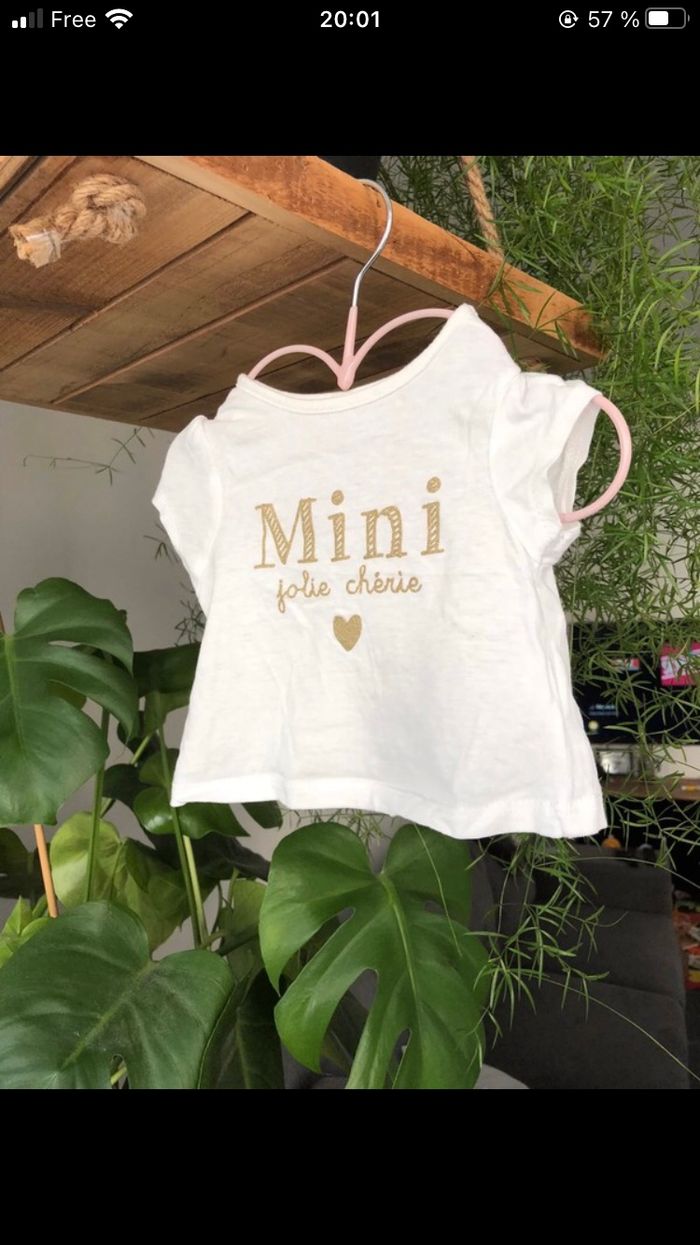 T-shirt en 1mois (52-55cm) de la marque Kiabi En très bon état Jamais porté