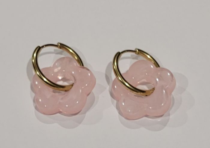 BOUCLES D'OREILLES CREOLES ANNEAUX DORES FLEURS ROSES ! NEUVE ! - photo numéro 3