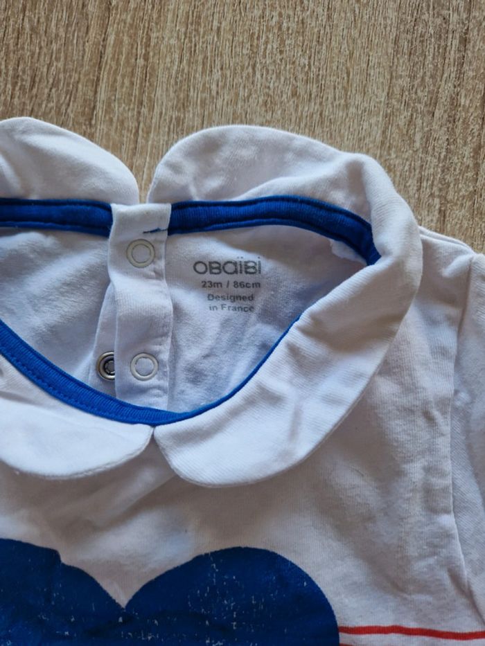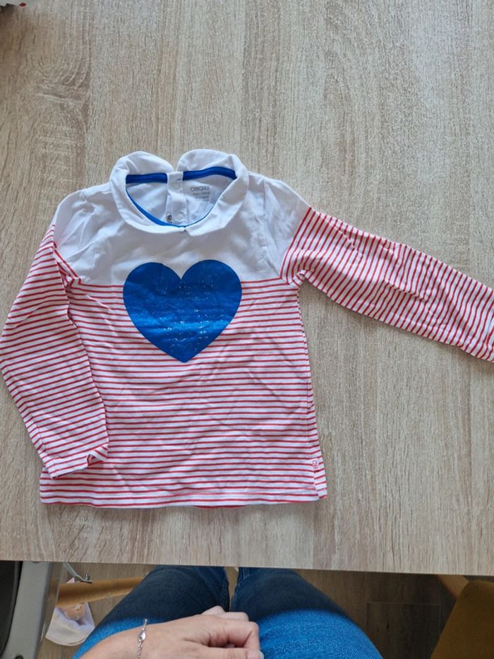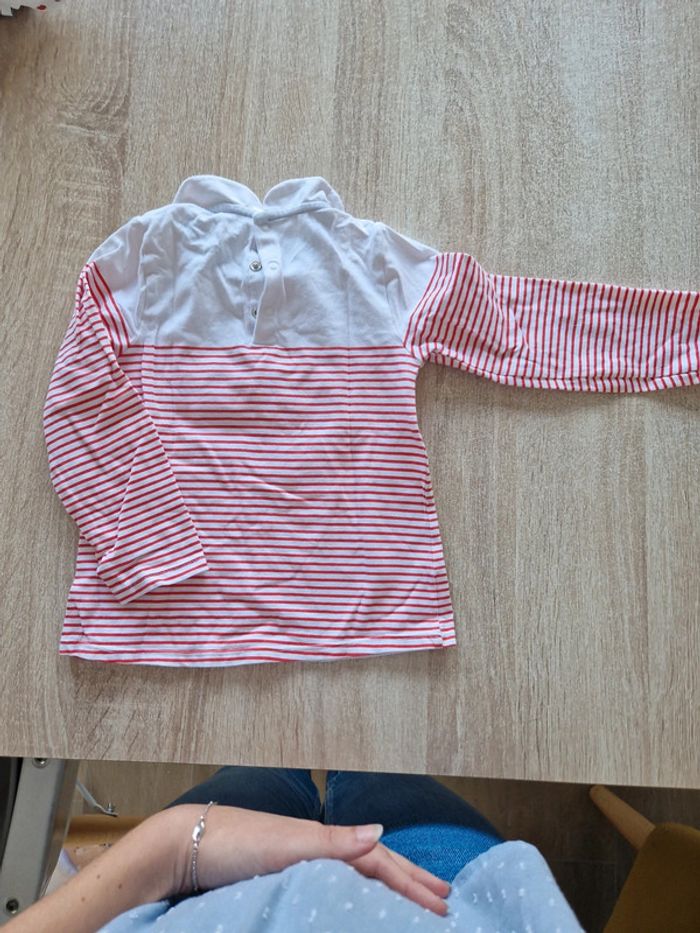 Polo manches longues okaïdi effet marinière rouge et blanche. Bon état général. Le cœur bleu s'écaille avec le temps. Taille 86cm