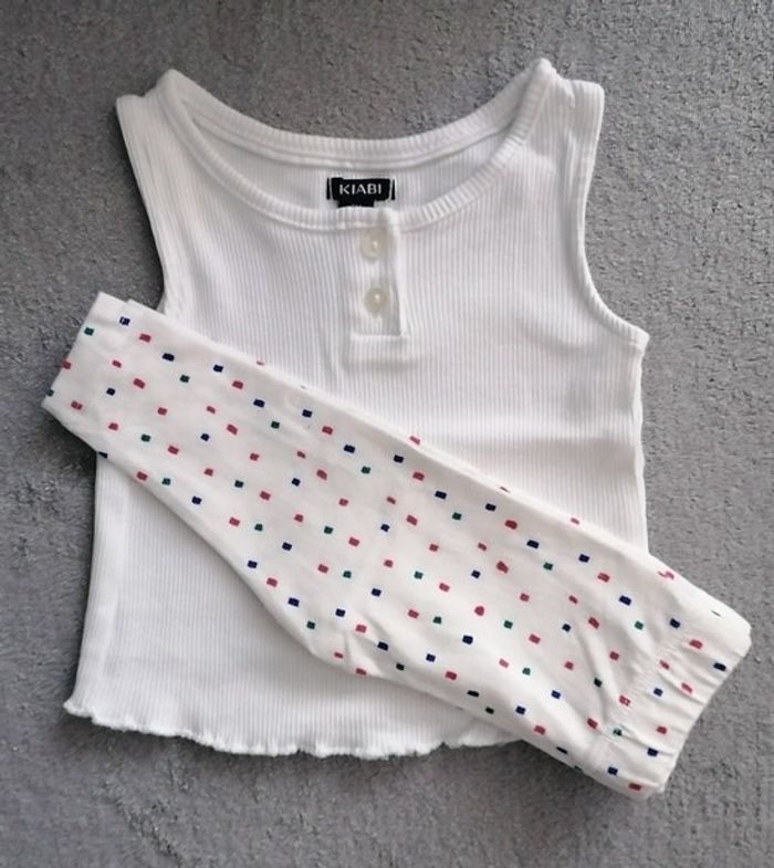 Débardeur + legging multicolor Marque : kiabi Age 3mois/56-62cm Haut blanc débardeur Legging à petit pois rouge Portée une fois, aucune tache 4.50€