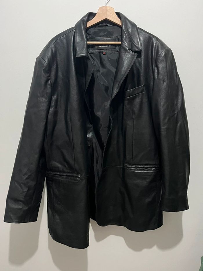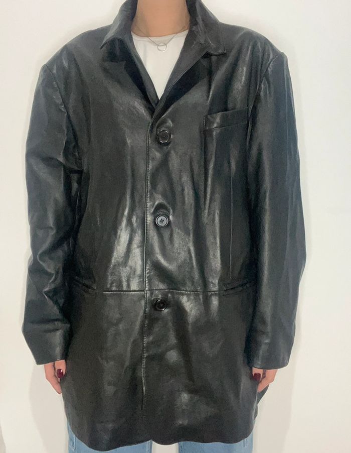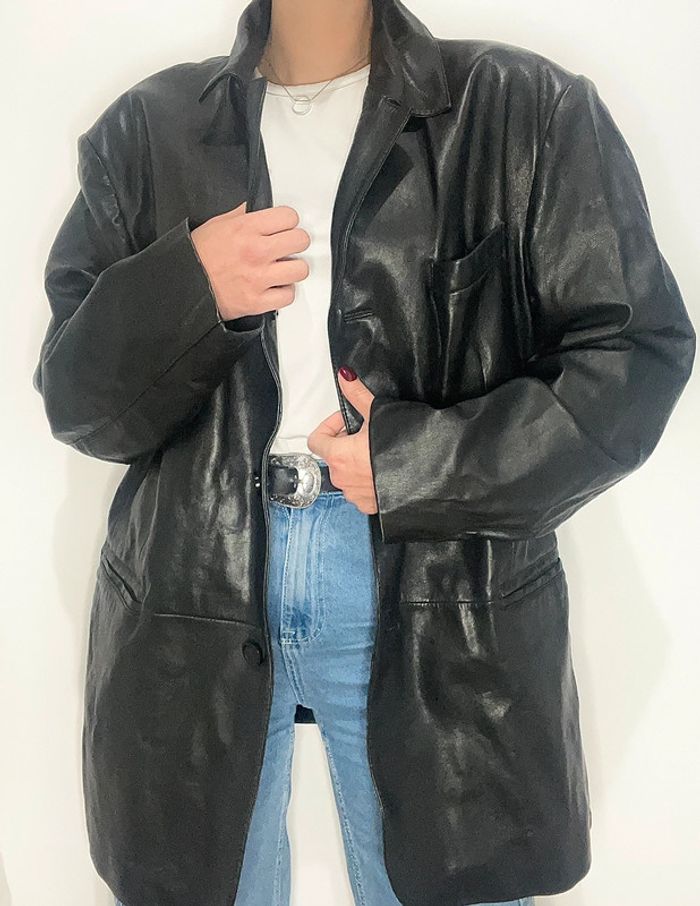 Veste en cuir véritable vintage et oversize uni noir - photo numéro 1