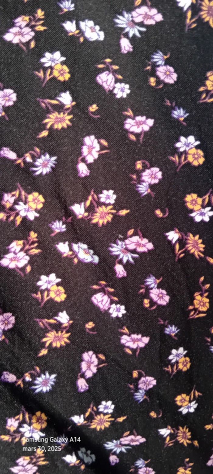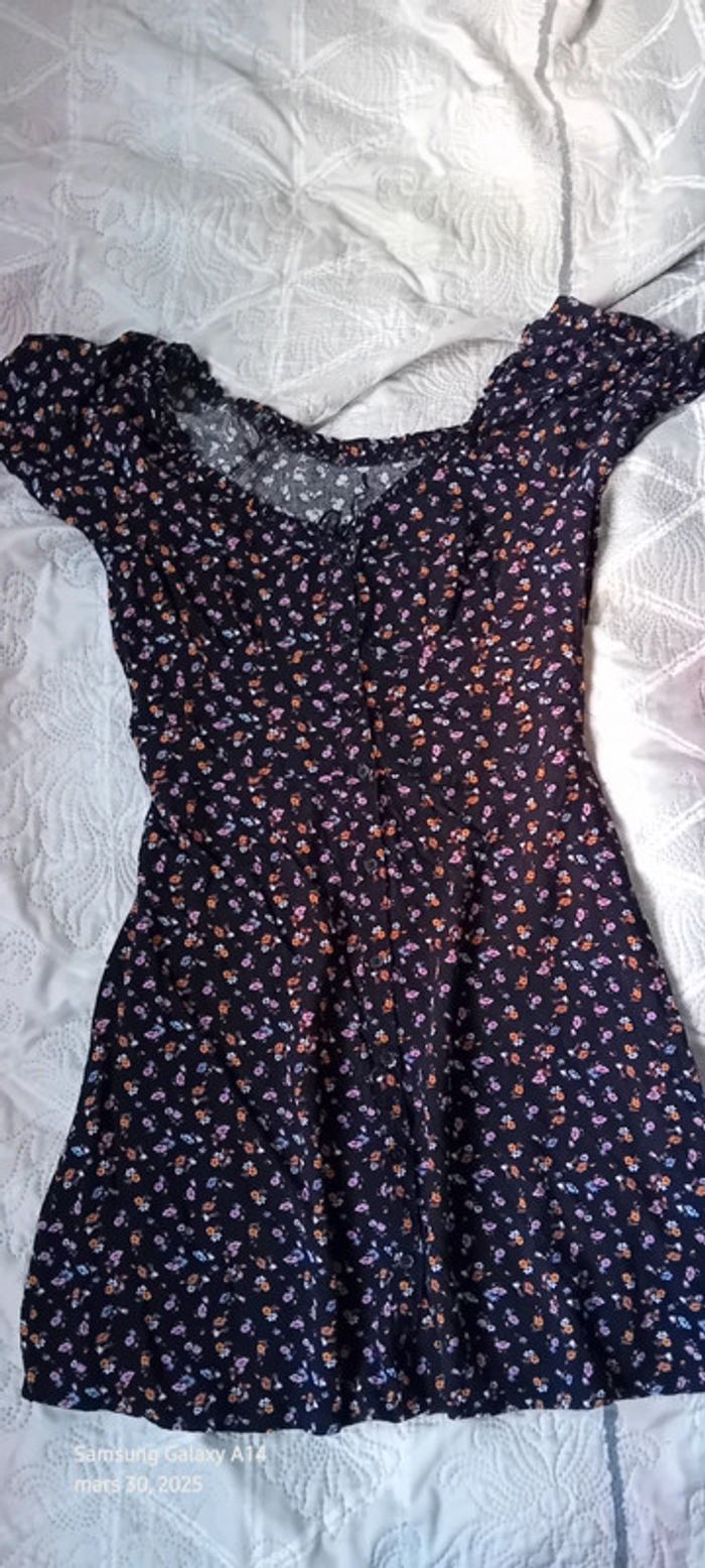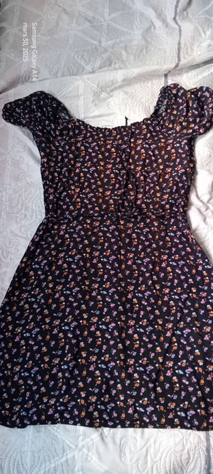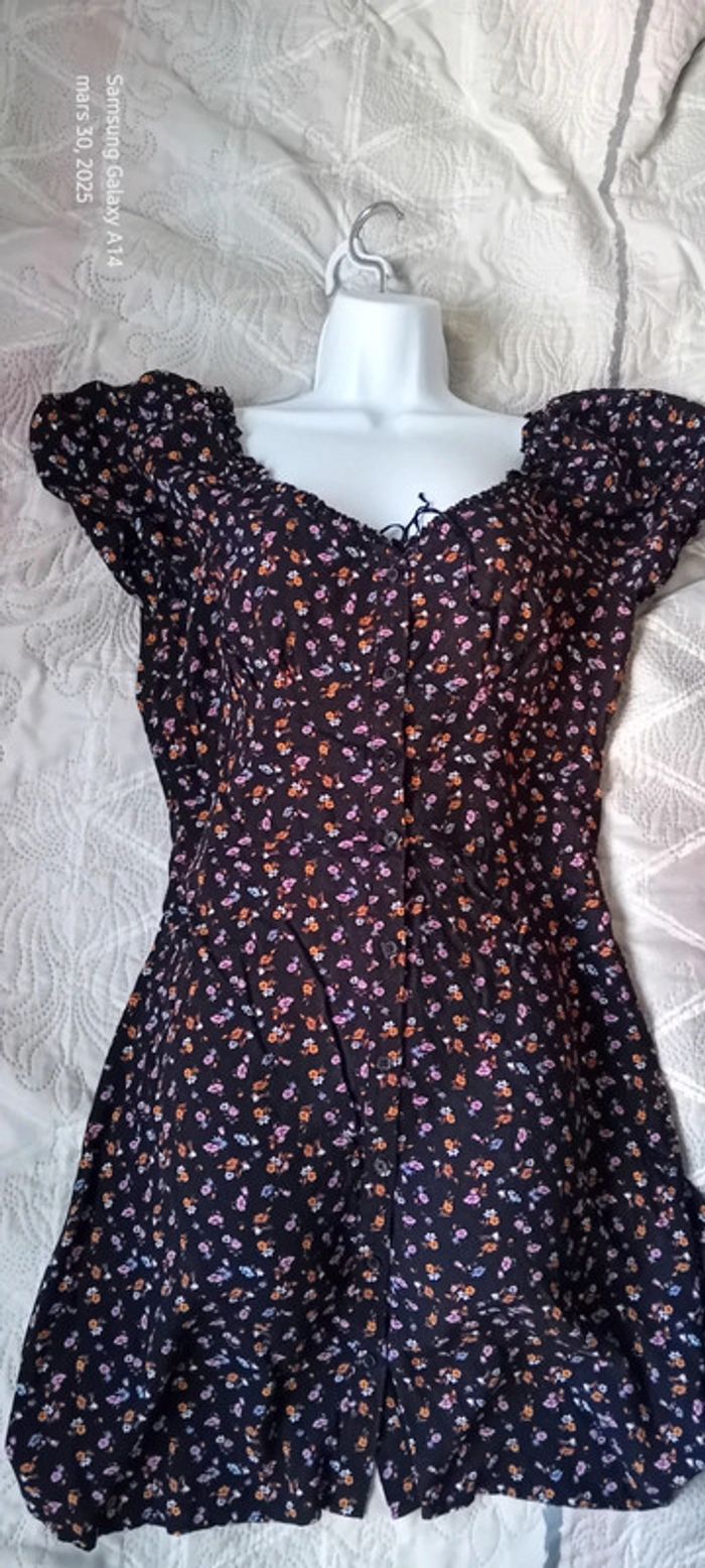 Robe légère en viscose et coton avec col large Bardot elastique avec lien boutons devant lien à nouer au dos manches courtes imprimé fleurs multicolores sur fond noir longueur 87 cm largeur aisselles à aisselles 45 cm peu portée en très bon état #midole #midolefemme #midolefemme38 #midolefemme40 ##femme40 #robefemme40 #robeimpriméfleuri40 #robeprintemps #robeprintemps38