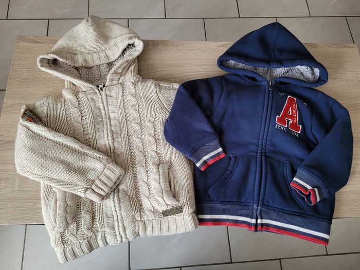 Vend lot de 2 gilets à capuche zippés intérieur chaud garçon taille 4 ans en bon état. Fermetures fonctionnelles. Marque Sergent Major et Palomino de chez C&A.
