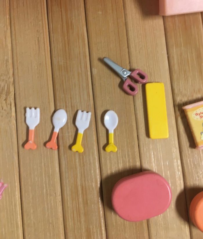 L'ensemble comprend un support de produit, , une enseigne, un panier, 2x récipient avec couvercle, 2x flacon suspendu, 1 livre, 1 ciseaux, 2x cuillères, 2x fourchettes, 1 règle