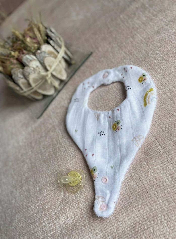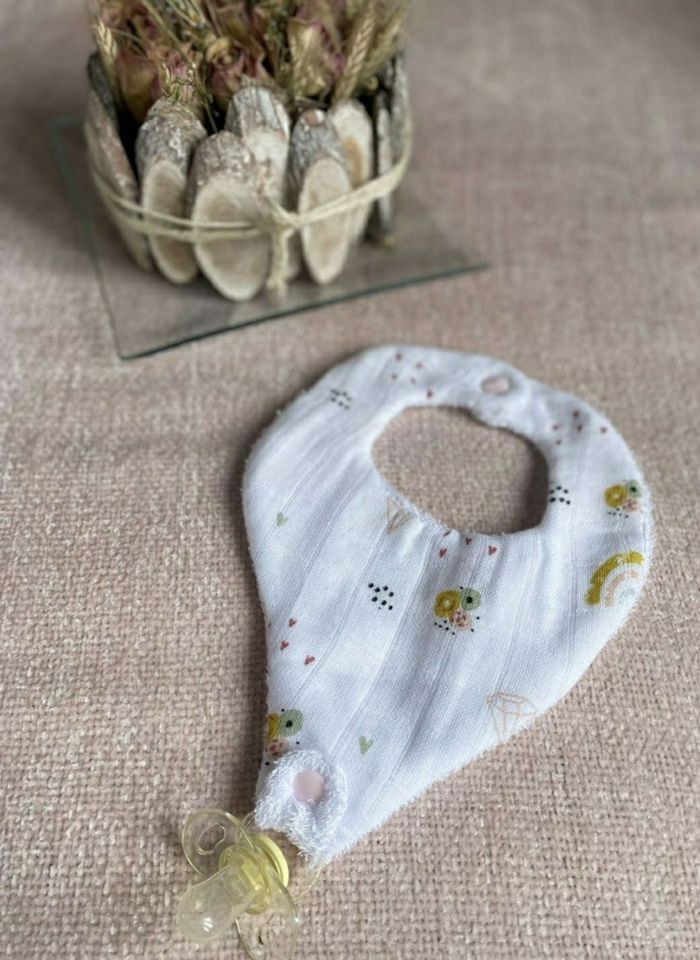 Un 2 en 1 parfait... Fini la tétine perdue, elle sera simplement attachée au bavoir. Composé d'un tissus coton/gaze de coton et d'un éponge bambou, il est facile d'entretien. Plusieurs coloris sont disponibles, il vous sera simole de le coordonner à la garde robe de bébé 🥰
