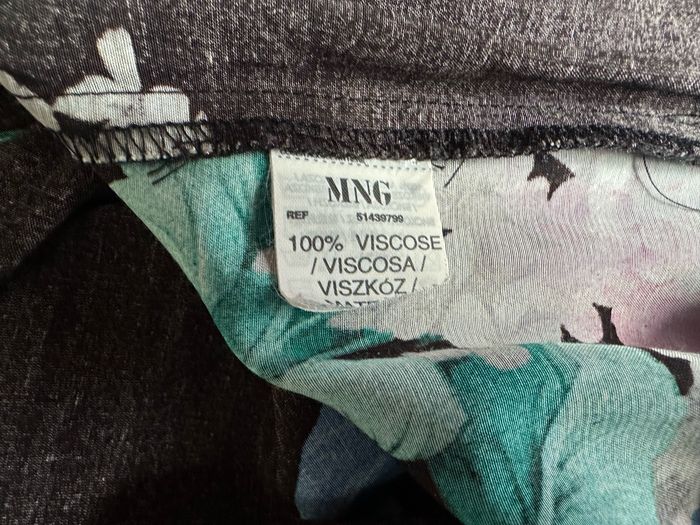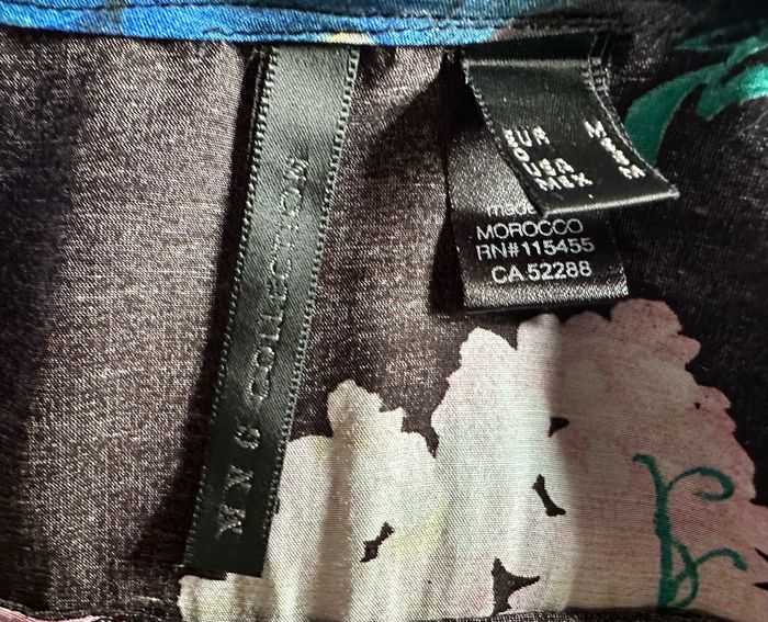Marque "Mango", noire fleurie multicolore. manches 3/4 relevables, fentes côtés, Tour de poitrine 104 cm, longueur 85 cm. matière 100% viscose.