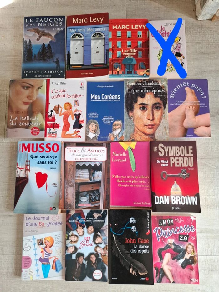 Livres brochés au choix , 5 euros les 2 😊 ou 3 euros l unité 👉Ce que veulent les filles ....Leigh Riker 👉Mes amis mes amours Marc Levi 👉N allez pas croire qu ailleurs l herbe soit plus verte...elle est plus loin c est tout ....Murielle Levraud 👉Mes Coréens Georges Arsenijevic 👉Le symbole perdu Dan Brown 👉Bientôt papa Thomas Hill 👉La première épouse Françoise Chandernagor 👉Une fille comme elle Marc Levi 👉Le faucon des neiges Stuart Harrison 👉La ballade du souvenir Thérèse Fowler(neuf sous blister) 👉Princesse Andy 👉Let it Snow 👉Le journal d une Ex grosse Anna Austruy 👉Que serais je sans toi Guillaume Musso 👉Truc & Astuces Calendrier 2014(4 trucs et astuces par jour ) 👉La danse des esprits John Case #clementine13430livres