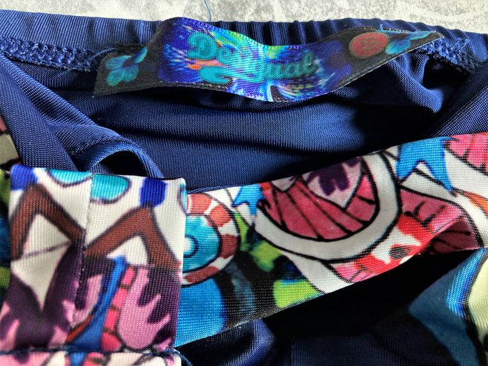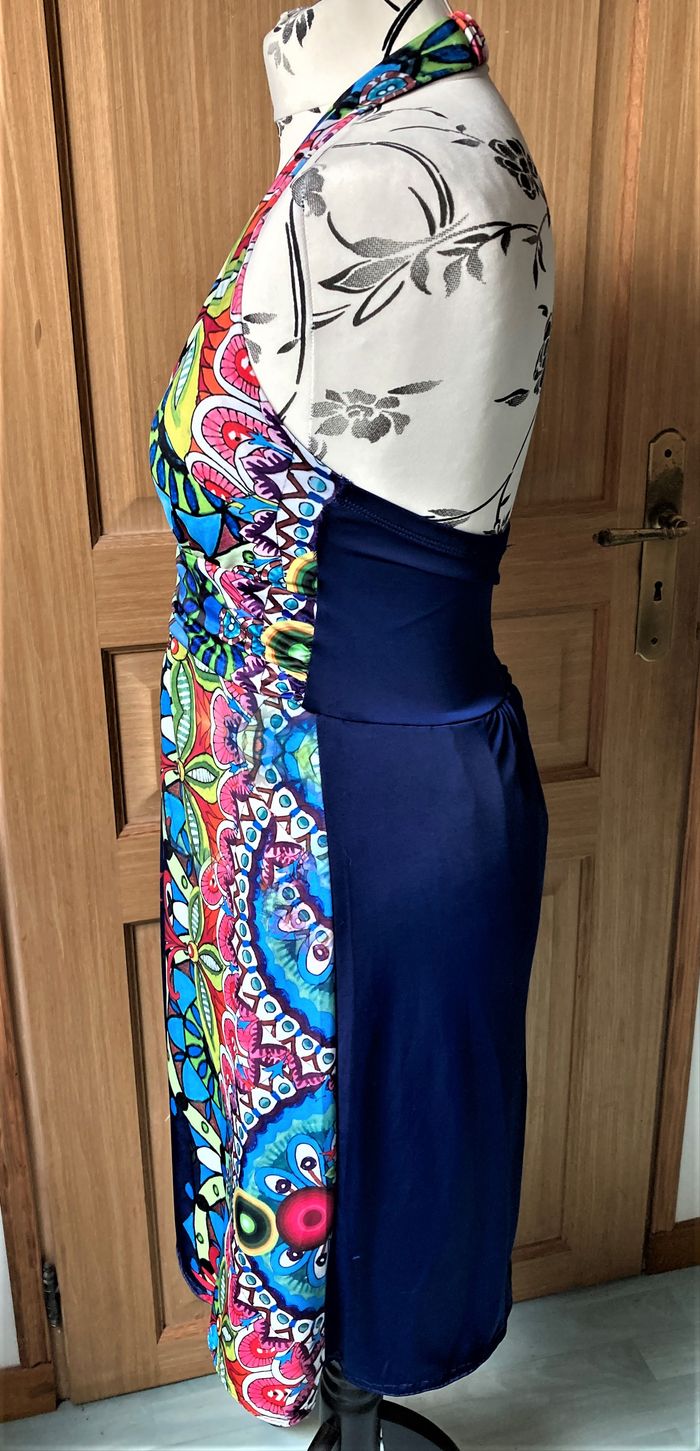 Marque "Desigual", multicolore devant et dos couleur marine. Matière extensible et fluide, coussinets poitrine, fronce à la taille et bretelles élastiquées. Tour de poitrine minimum 85 cm, longueur 86 cm.