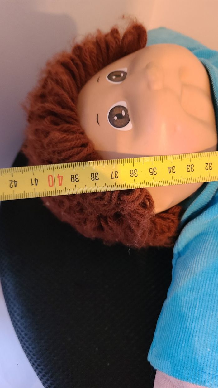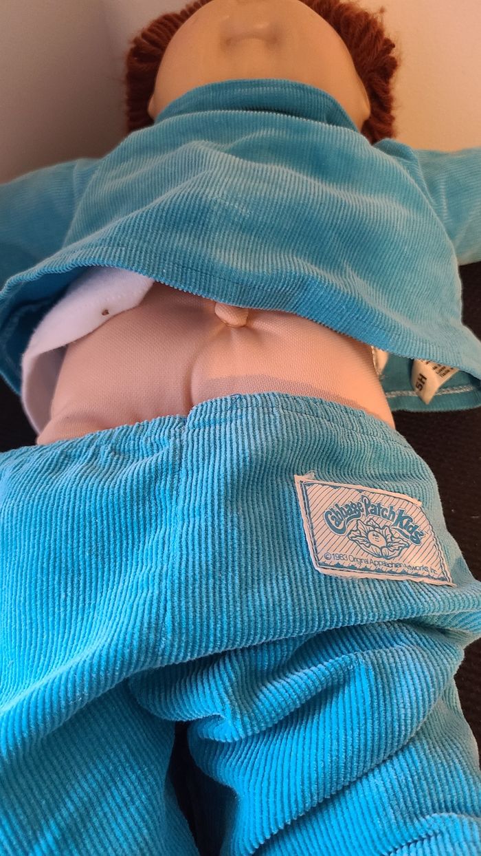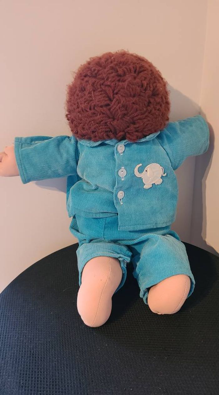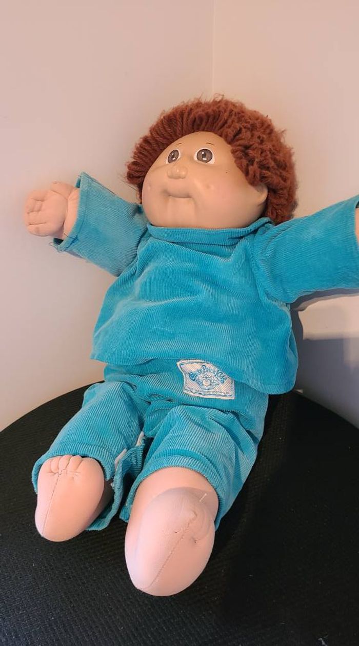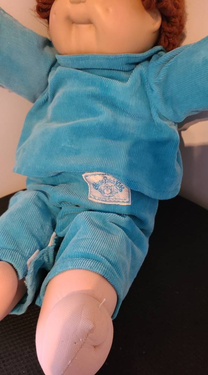 Cabbage patch enfant en super état portant un pyjama authentique bleu turquoise en velours côtelé Signé par Xavier Roberts en poupée bleue 1985 aux yeux marron et pyjama en velours côtelé en laine auburn avec motif ours, boutons et pantalon velcro