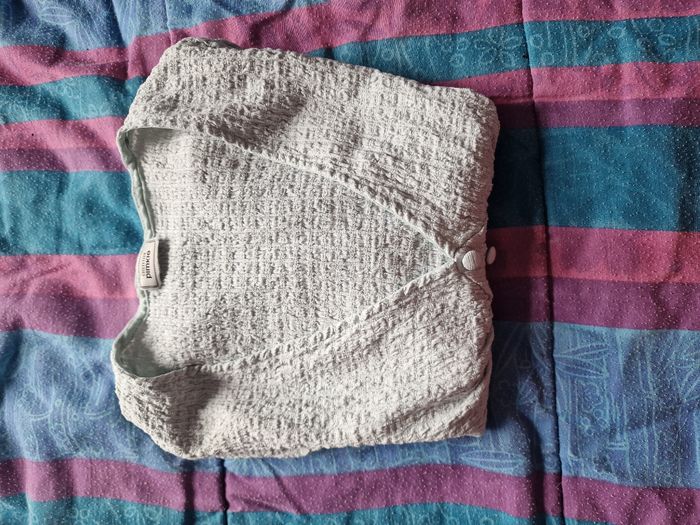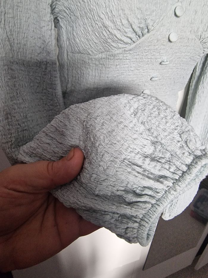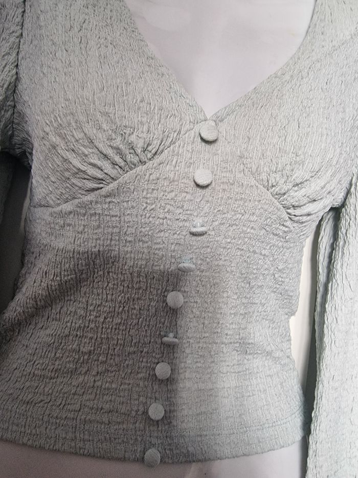 Pour une sortie habillée ou pour tous les jours, ce jolie haut effet bustier mettra en valeur votre décolleté mais aussi votre taille grâce à ce beau tissu effet chiffonné extensible qui suivra vos courbes. Ses manches resserrées légerement, ses épaules plissée et sa boutonnière décorative donnent à ce petit haut un superbe effet vintage. Couleur gris bleu ciel Mesures aisselles de 30cms à plat et jusque 40cms en tirant Hauteur 44cms Je n'ai pas remarqué d'anomalie