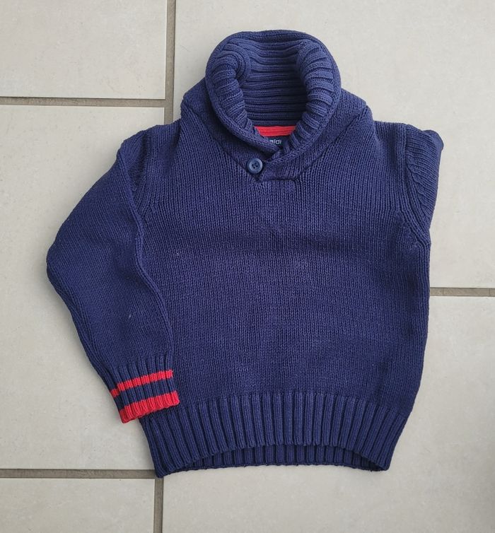 Pull de couleur marine, avec petites touches de rouge, de la marque Okaidi, taille 5 ans (110 cm), en très bon état. Article lavé pour la vente.