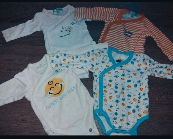 Lot de 4 bodies Taille 1 mois 54 cm 2 marque Les Petits Cailloux 2 marque Smiley #body #bodybébé #bodybébégarcon #bodybebe1mois #bebe1mois #body1mois #lespetitscailloux #lespetitscailloux1mois #petitscailloux #petitscailloux1mois