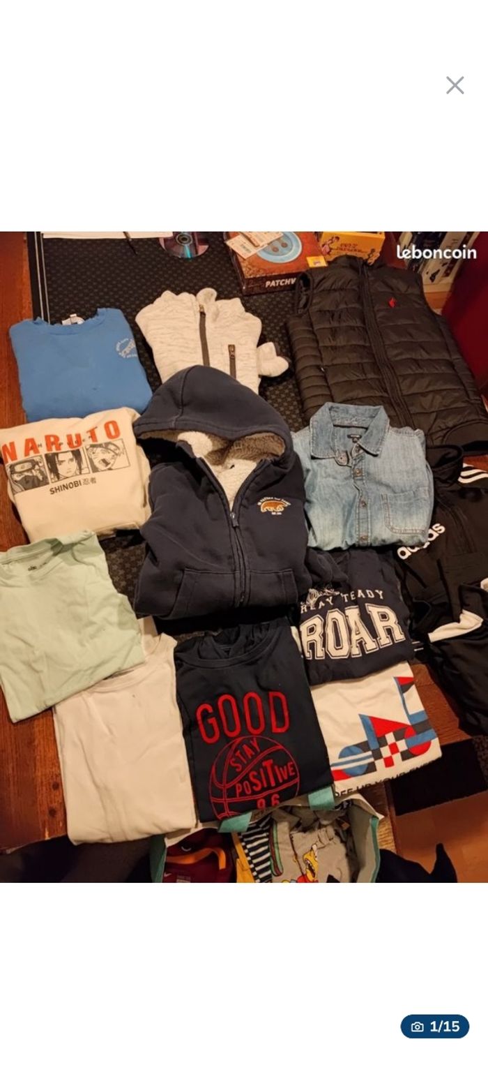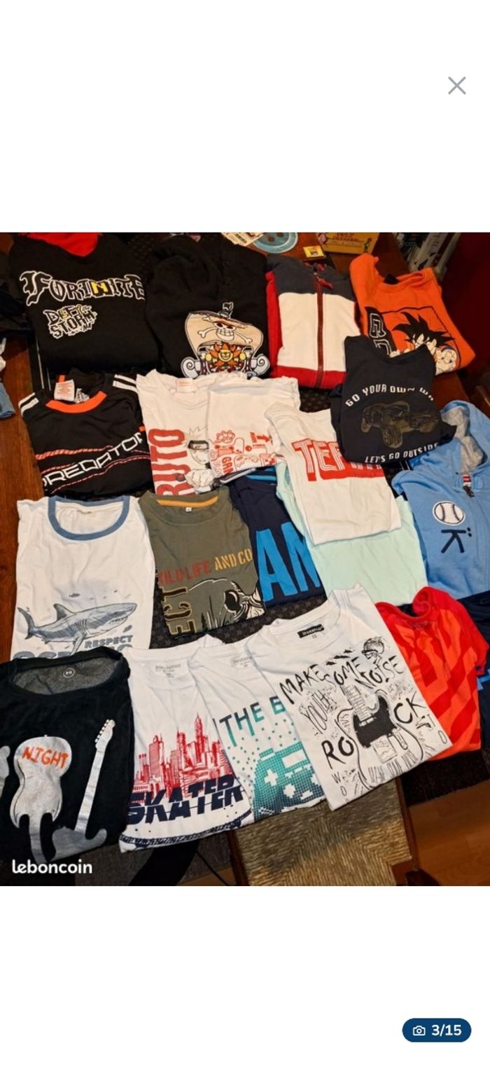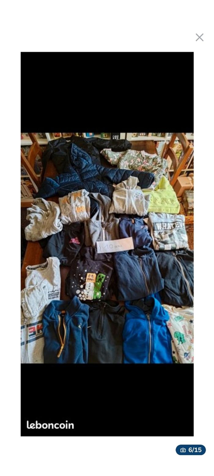 Maison non-fumeur et sans animaux Envoie possible et livraison possible sur Sens et les alentours Un blouson motif fleur vert et rose Un blouson noir sans capuche Fais une doudoune bleu marine Kiabi Un sweat gris clair à capuche avec écriture always happy my lot Un sweat noir Nike à capuche Un sweat vert fluo de marque liberto Un sweat à capuche 1895 écris en orange un sweat à capuche gris numéro 89 écrit au milieu Un sweat bleu marine à capuche Gémo Un sweat gris à capuche sans inscription Un sweet bleu marine à capuche sans inscription de marque Kiabi Un sweat à capuche noir Kiabi Une veste de jogging adidas écrit en rose Un sweat Minecraft à capuche Un sweat gris de marque complice Un sweat avec plein de motifs dinosaures Un sweat à capuche bleu Kiabi Un t-shirt manches longues noir Nike pour le sport Une polaire bleu marine Un sweat sans capuche de marque freegun gris Un sweat gris à capuche de marque Creeks une doudoune sans manche noire une doudoune bleu marine Kiabi quasi neuve un blouson Vertbaudet à capuche bleu marine avec moumoute sur la capuche qui peut s'enlever un blouson imperméable noir et polaire à l'intérieur une doudoune nike noir un sweat fourré à capuche et fermeture éclair bleu marine de marque Vertbaudet un t-shirt manches courtes Naruto deux t-shirt manches longues blanc avec des motifs un t-shirt manches courtes the best un t-shirt manches courtes bleu marine Head un t-shirt manches courtes kipsta de chez Decathlon orange un t-shirt manches courtes kaki avec un dessin de rhinocéros un t-shirt manches courtes bleu Vertbaudet un polo Kiabi vers eau un t-shirt manches courtes blan la halle avec dessin de gamer un t-shirt manches longues bleu marine avec une jeep destinée dessus un t-shirt Predator Adidas noir et orange un sweat bleu ciel Okaïdi à fermeture et capuche un sweat capuche fourré bleu marine Okaïdi un sweat bleu vert avec une étoile dessinée au milieu à capuche un sweat One piece à capuche noir un sweat fortnite noir un sweat bleu blanc rouge Vertbaudet un sweat orange Dragon Ball z avec Sangoku un sweat gris à capuche et fermeture éclair un sweat bleu avec un skateboard sans capuche 7 bas de jogging : 4 Decathlon noirs , un Nike noir et un molleton noir quasi neuf+ plus un Gémo noir un sweat Vertbaudet bleu marine écrit London dessus un sweat crème Naruto à capuche 2 vestes de jogging Adidas de sport 1 sweat Jack & Jones bleu marine à capuche une chemise en jean manches longues un sweat avec un col sans capuche bleu et blanc je rajoute plusieurs pyjamas des t-shirts manches courtes 1 sweat le coq sportif 1 sweat nike gris 1 sweat nike sherpa noir 1 kway Benetton + quelques vêtements 12 ans deux sweat orange à capuche un sweat blanc un t-shirt ellesse bleu marine un jean bleu marine Vertbaudet 2 pyjamas