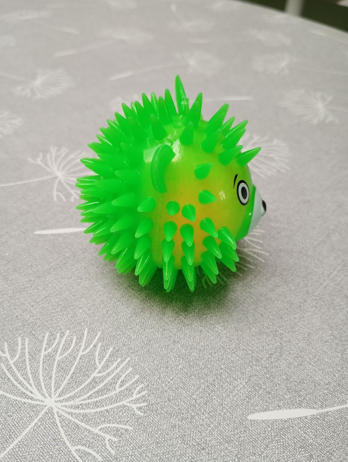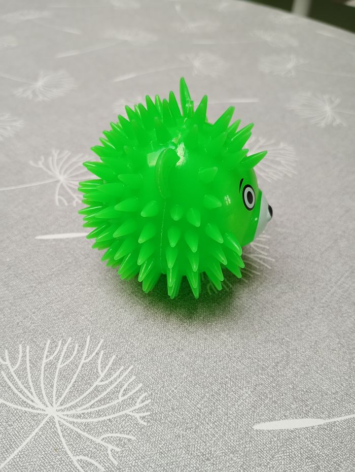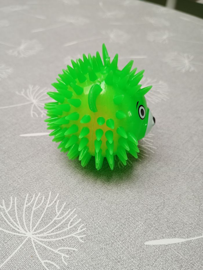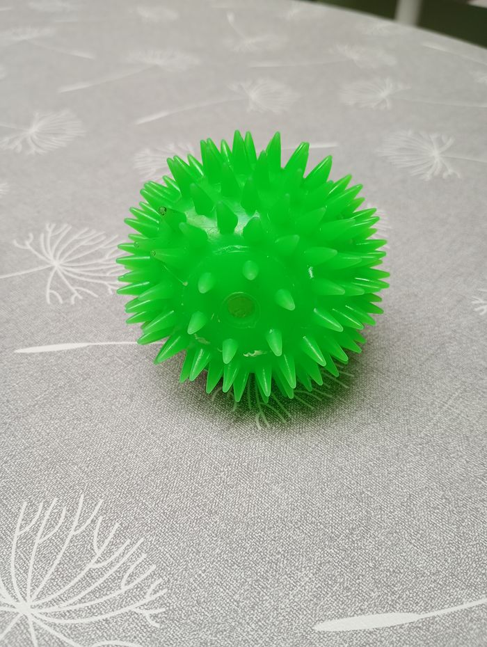 Balle verte fluo qui fait de la lumière et clignote quand on la lance. Diamètre : 7 cm. Très bon état.