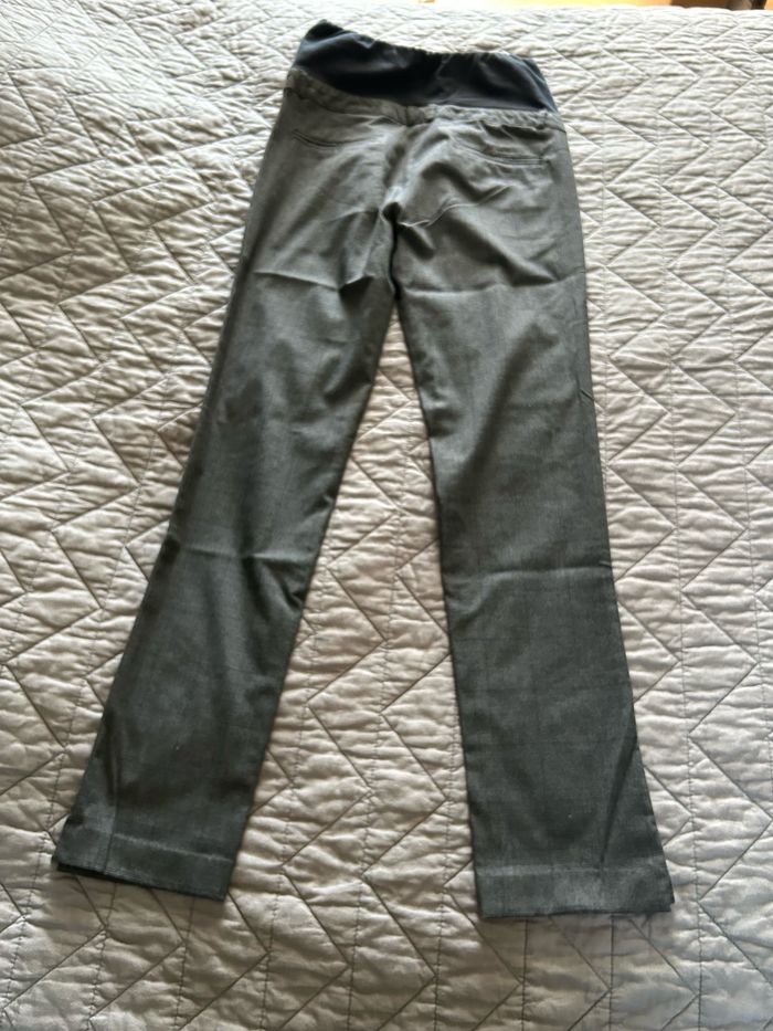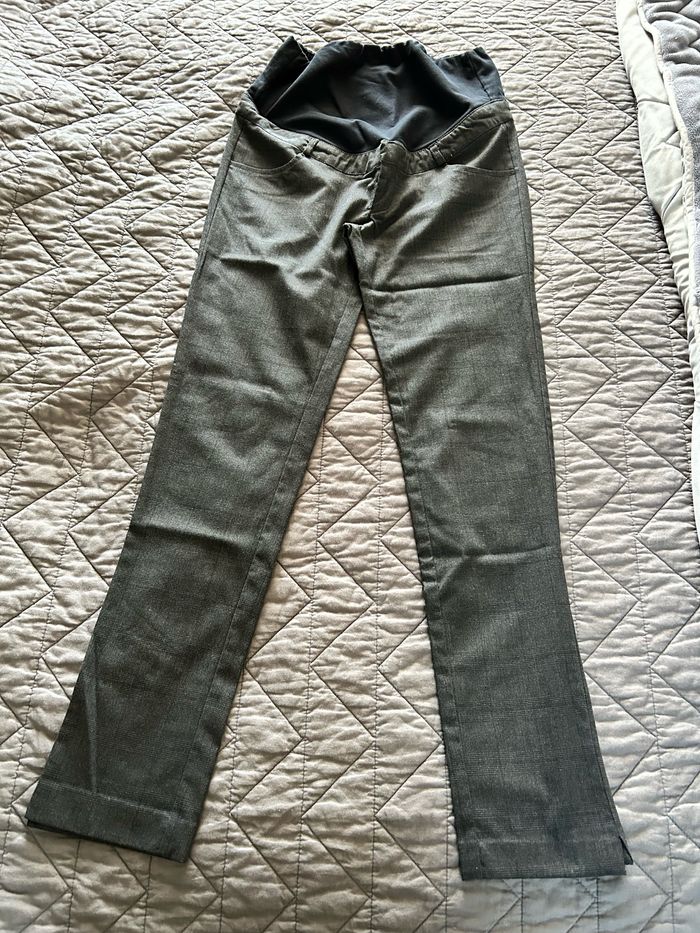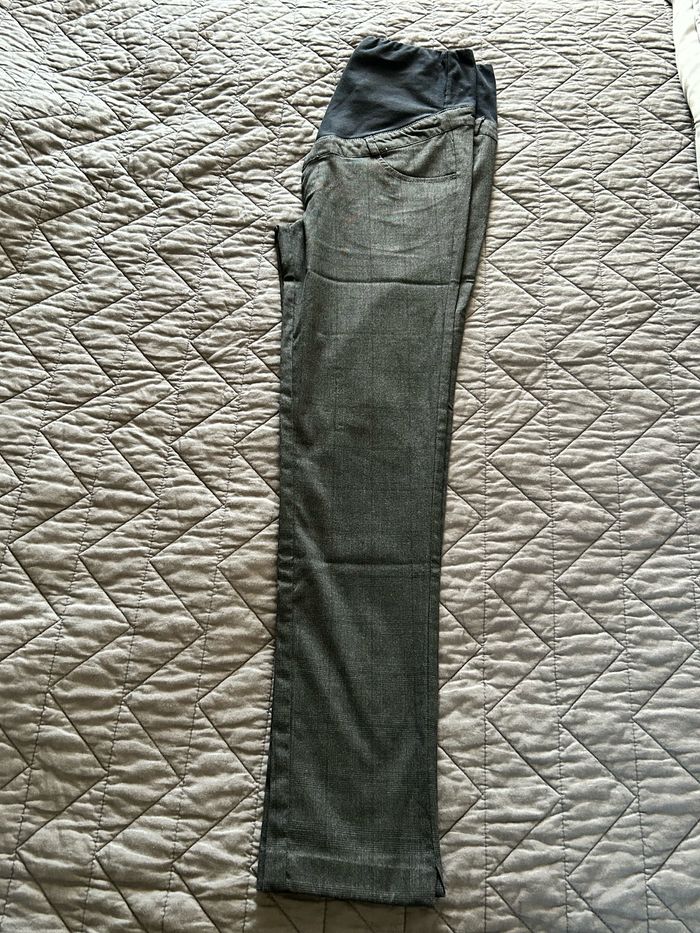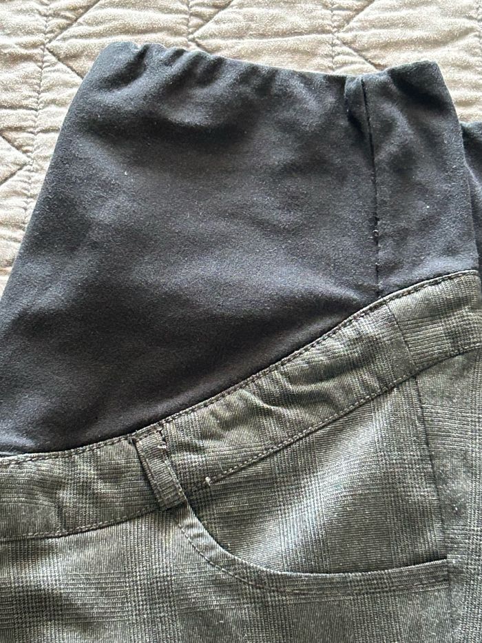 Pantalon de grossesse forme pantalon cigarette, taille 38 de la marque « H&M Mamma ». Couleur gris anthracite et noir à carreaux. Empiècement en tissu souple qui s’adapte parfaitement au ventre de grossesse jusqu’aux terme. En excellent état.