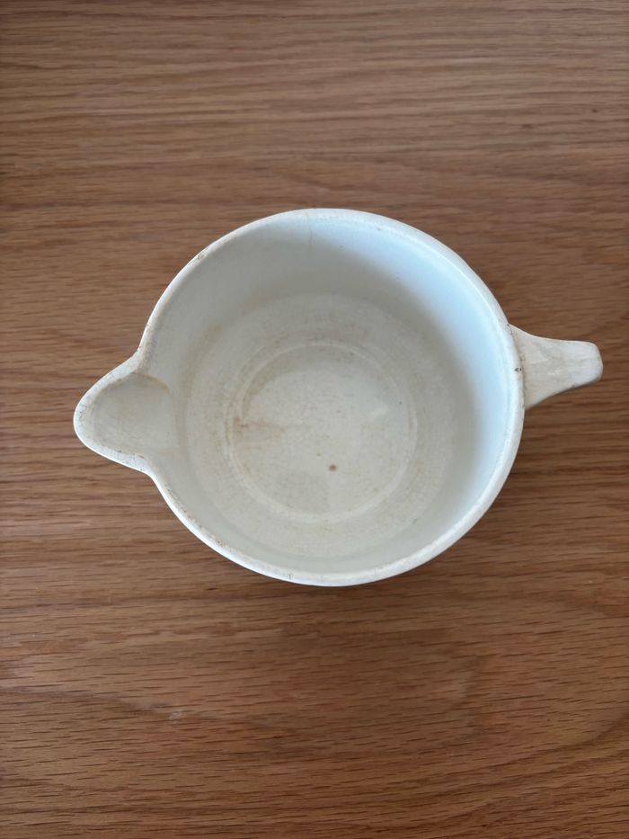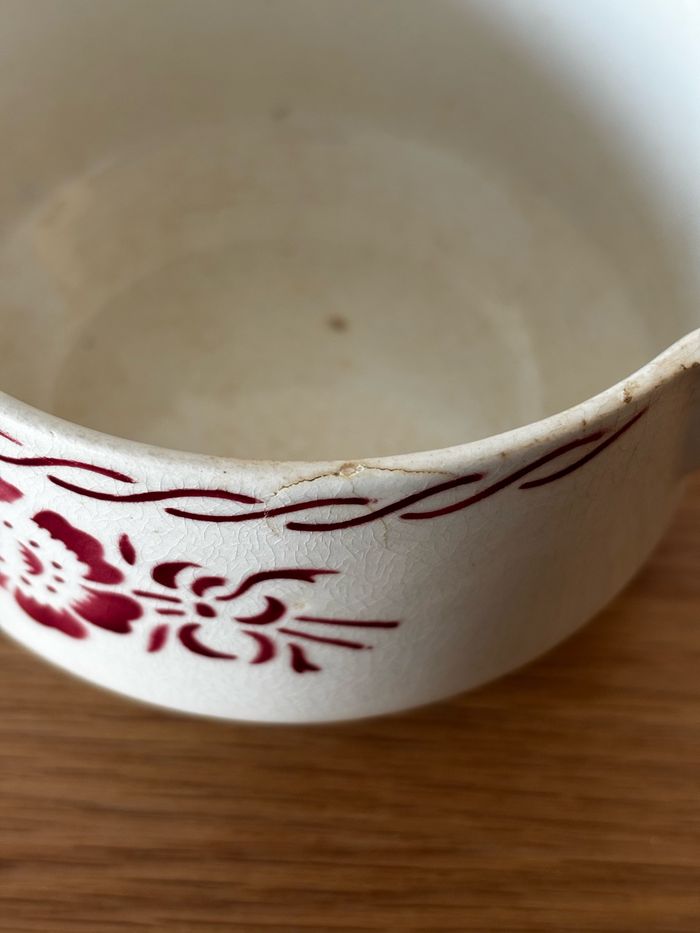 Vintage saucière Fabriquée en France Tampon difficile a déchiffrer, peut etre St Amand? Fleurs roses En bon état global malgré de petits défauts liés au temps visibles sur la photo Diamètre 10.7 cm et hauteur 7 cm