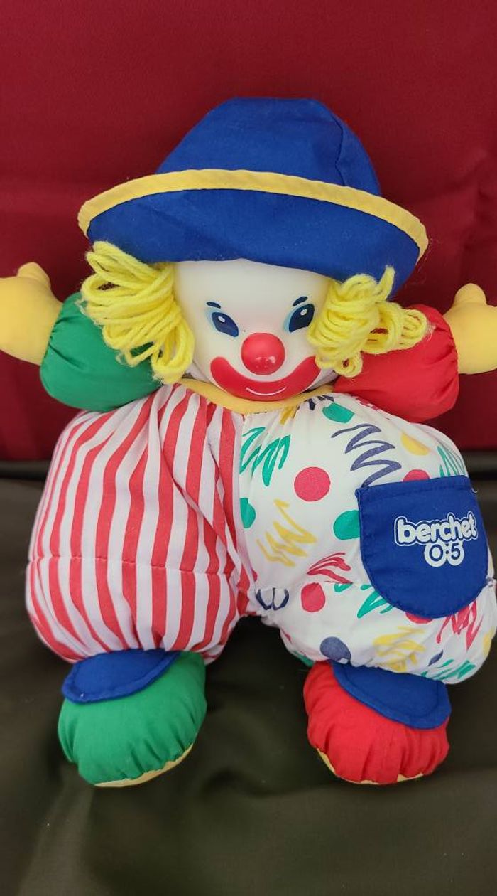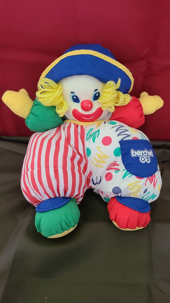 BERCHET VINTAGE DOUDOU PELUCHE CLOWN JAUNE BLEU ROUGE VERT 35CM - photo numéro 1