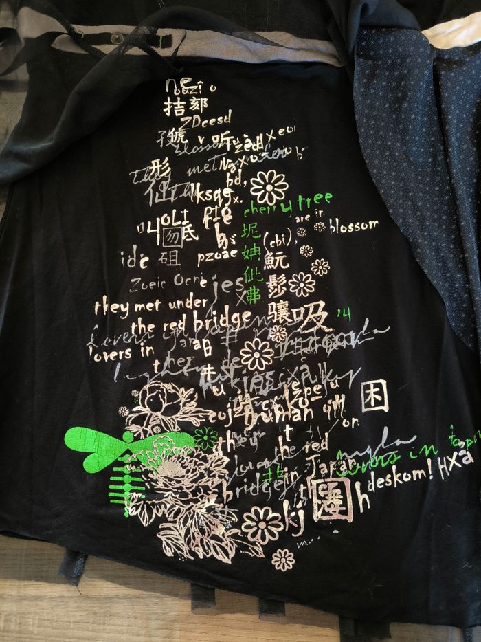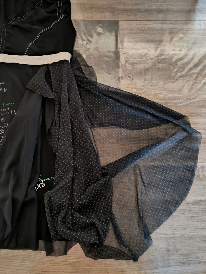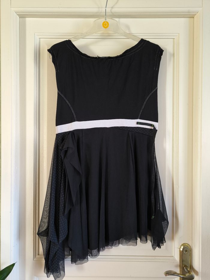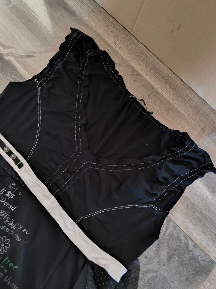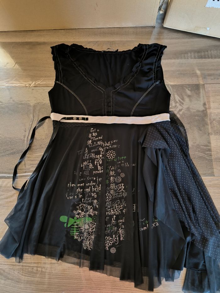 Tunique sans manches Modèle samouraï Marque La mode est à vous Taille 40 • Coloris noir, argenté, vert • Inscriptions • Col V • Voilage • Tissu fin, stretch • Inscriptions qui craquellent Largeur aisselle à aisselle non étirée : 42 cm Largeur aisselle à aisselle étirée au maximum : 64 cm Longueur totale : 70 cm Longueur aisselle : 50 cm En très bon état #evelyne_taille_40