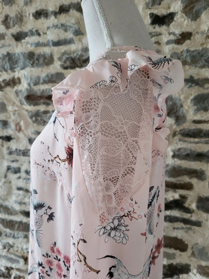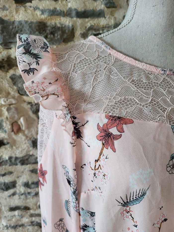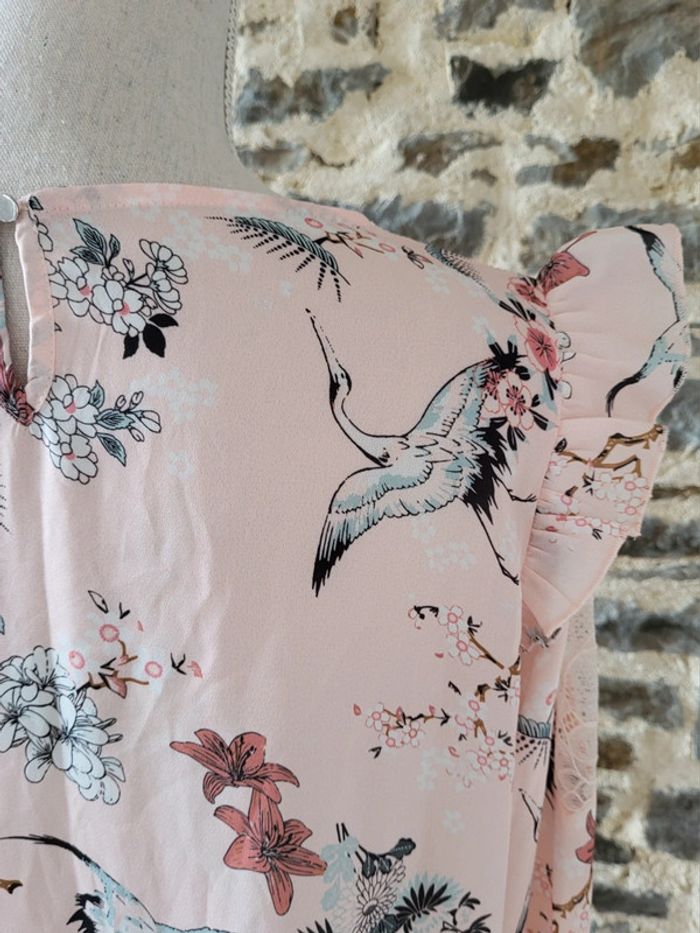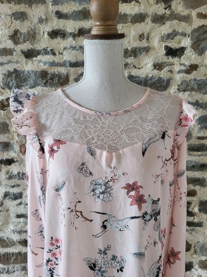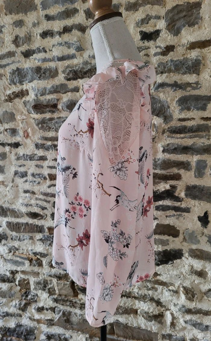 Très jolie blouse manches longues à dentelle rose motifs fleurs et oiseaux