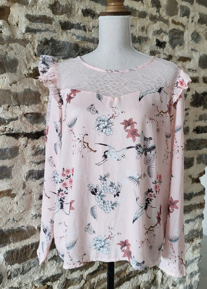 #matka27_taille40 #taille40 #gemo #blouse #mancheslongues #motifs #fleuri #oiseaux #dentelle #rosepoudre #rose