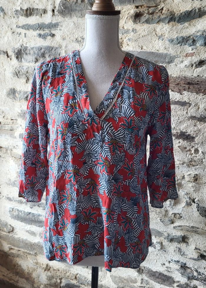Blouse manches 3/4 fleurie rouge noir et blanc Caroll Taille 40 - photo numéro 1